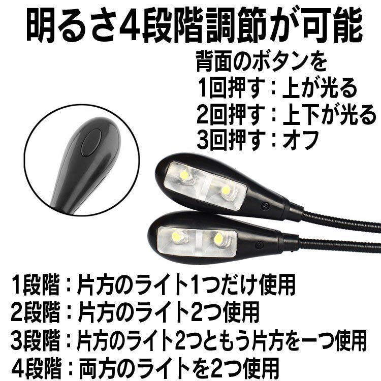 ◆クリップ型フレキシブルスタンドライト 2本 4灯LED ブックライト 譜面台ライト 乾電池またUSB給電 BOOKL22