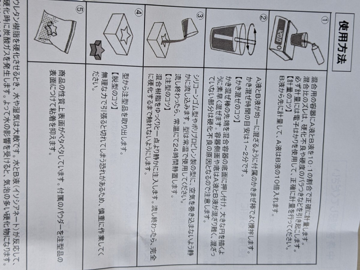 混ぜるときの重さの比率がかなりタイトなようですので、説明書にある通り、正確なデジタル計りなどが必要になりそうです