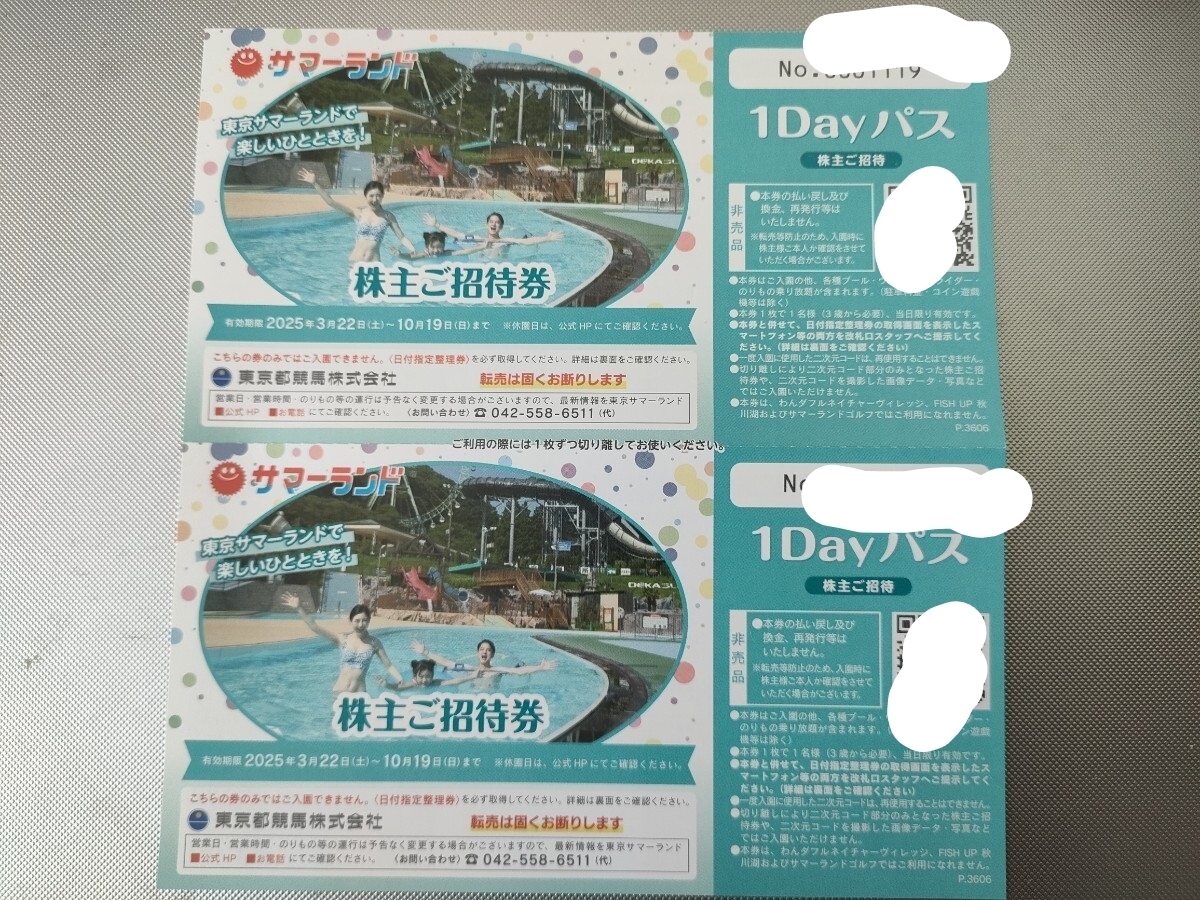 サマーランド 1デイパス 株主ご招待券 株主優待券 2枚セットです。