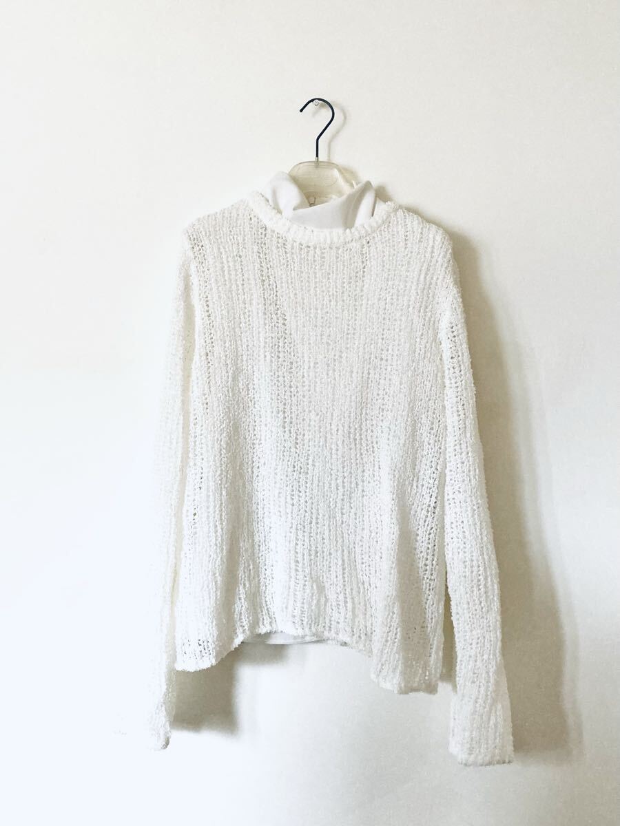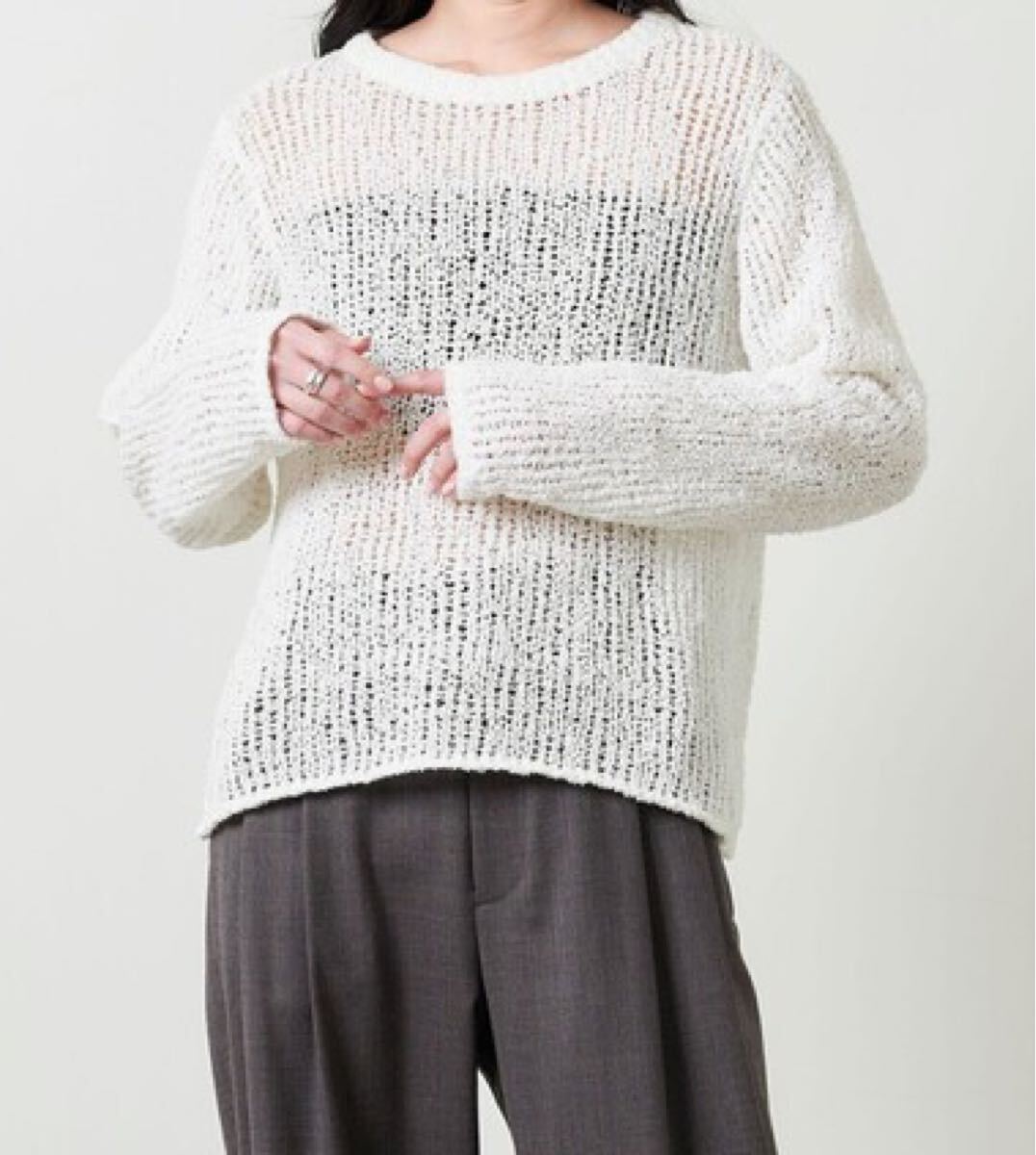 清涼感のあるドライタッチな肌触りの和紙を配合したシアーニット。程よく開いたネックとゆとりのあるシルエットが 大人のこなれ感。合わせるインナーによって 様々な着こなしが春〜秋まで可能。今シーズンの未使用保管品。
