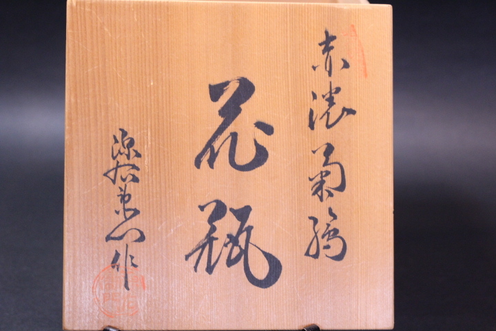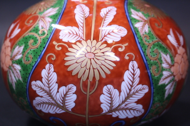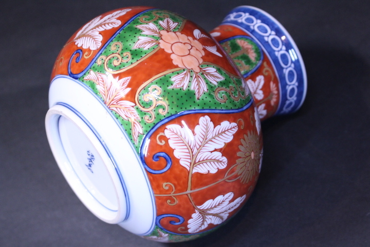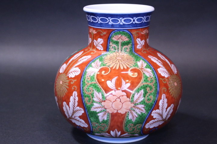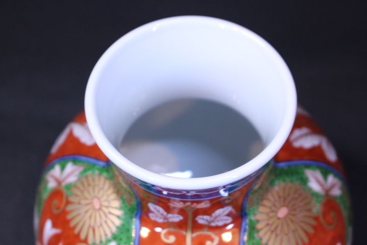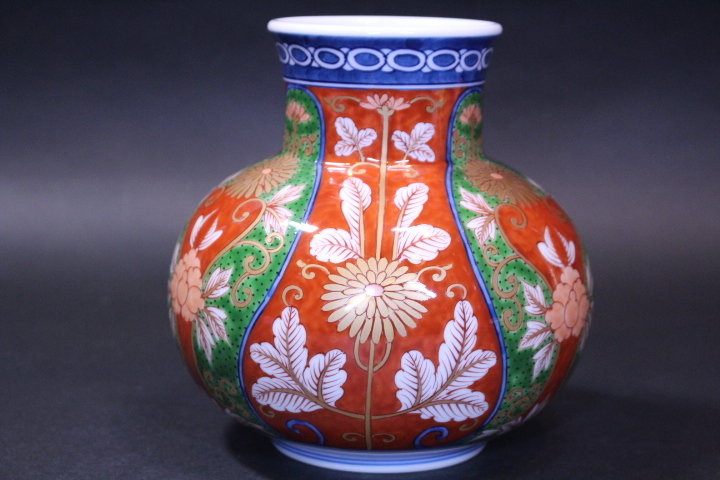 x-6900 館林源右衛門作 赤絵菊鶴文花瓶 花器 共箱 花入