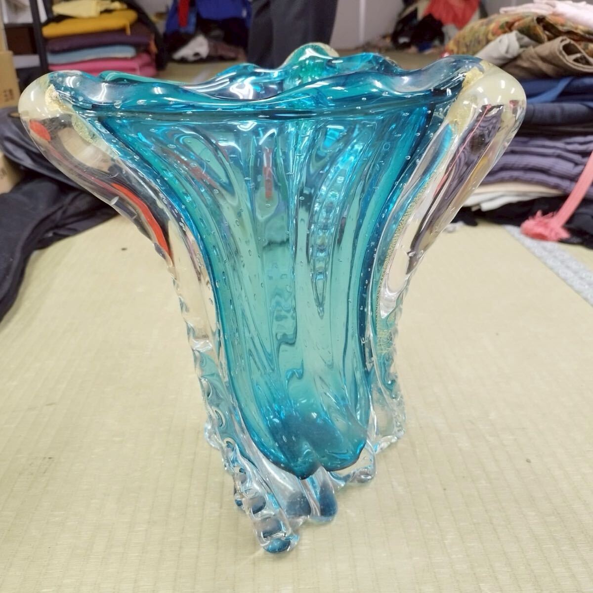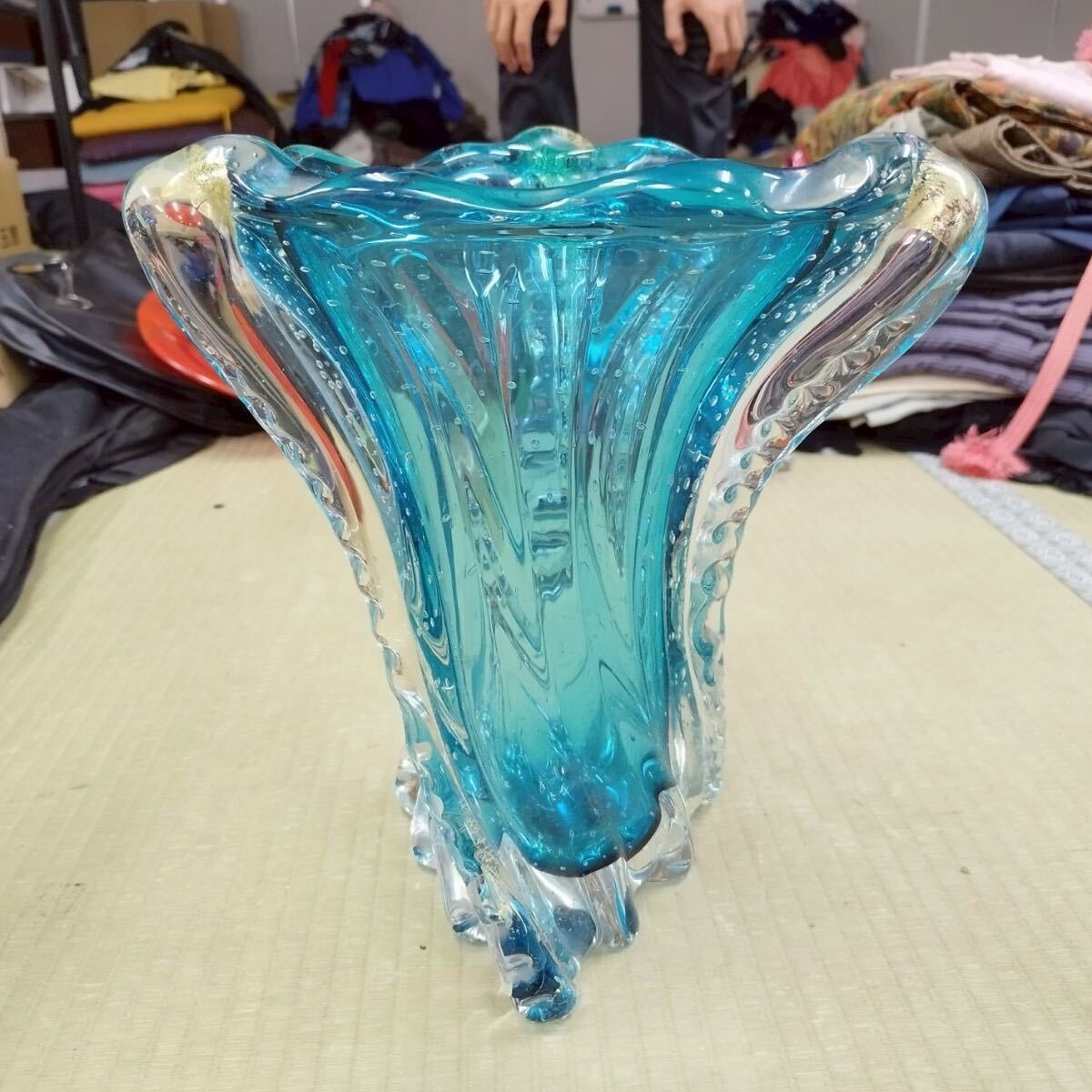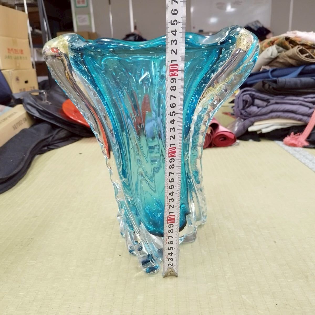 戸05b 青ガラス 花瓶 クリスタル 色被せ 花器 茶道 花道 生花 池坊 自由花 モダン 近代美術 海 波 抽象的 オブジェ フラワーベース