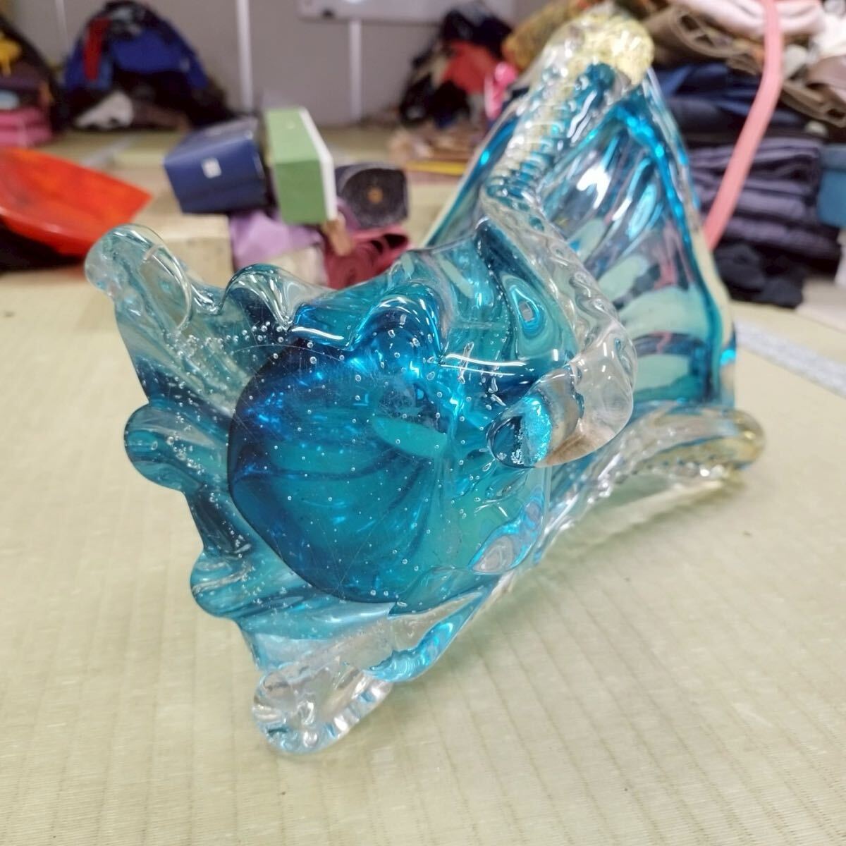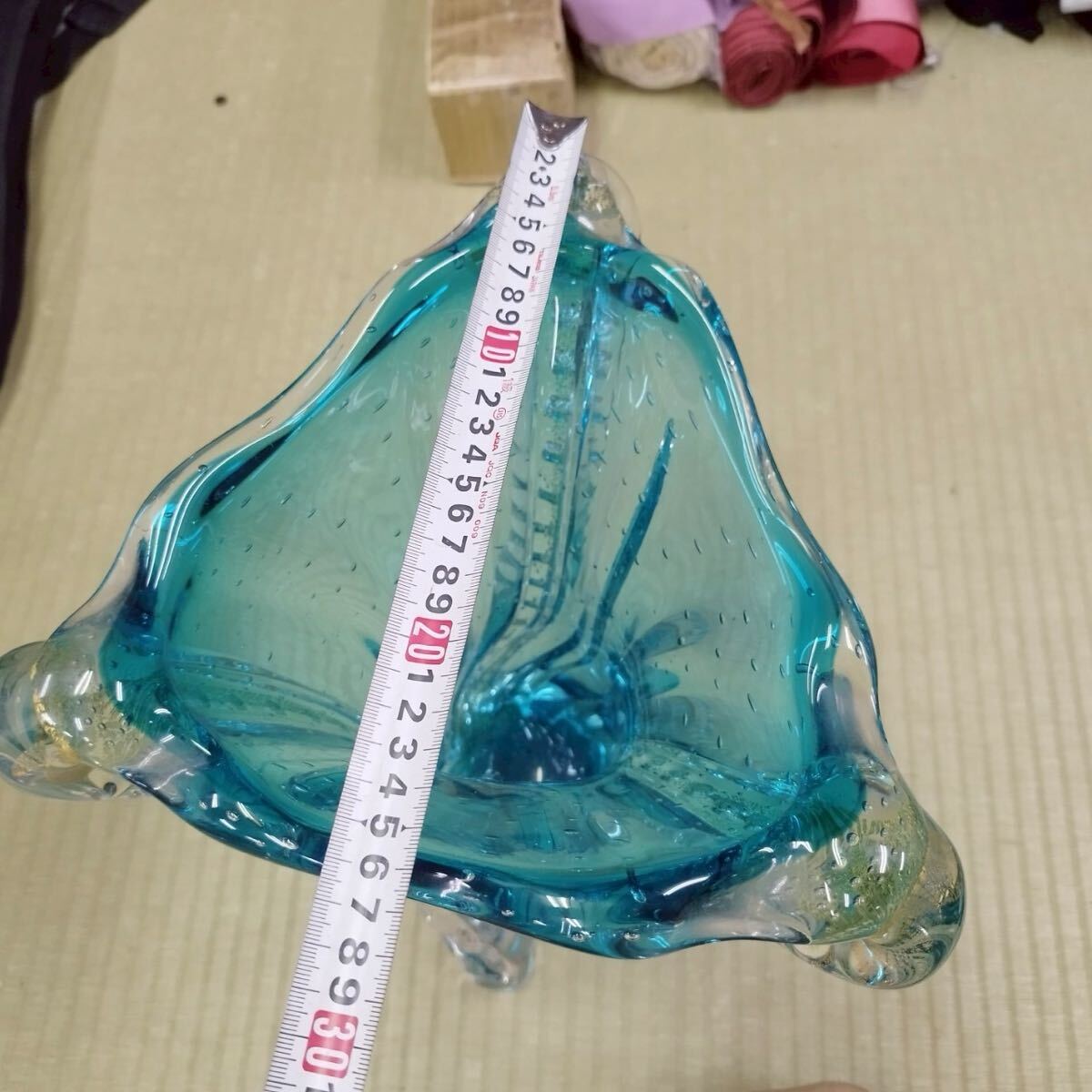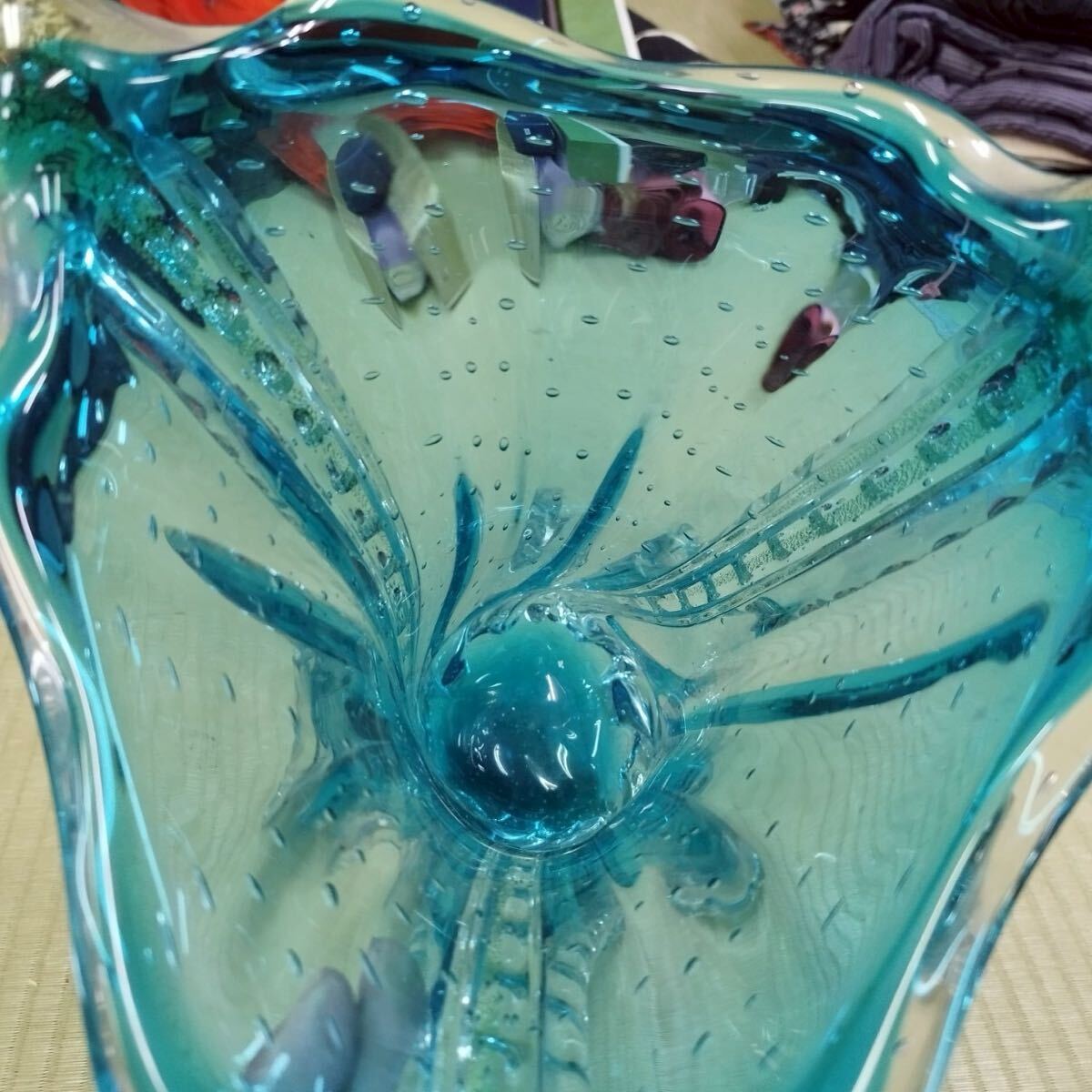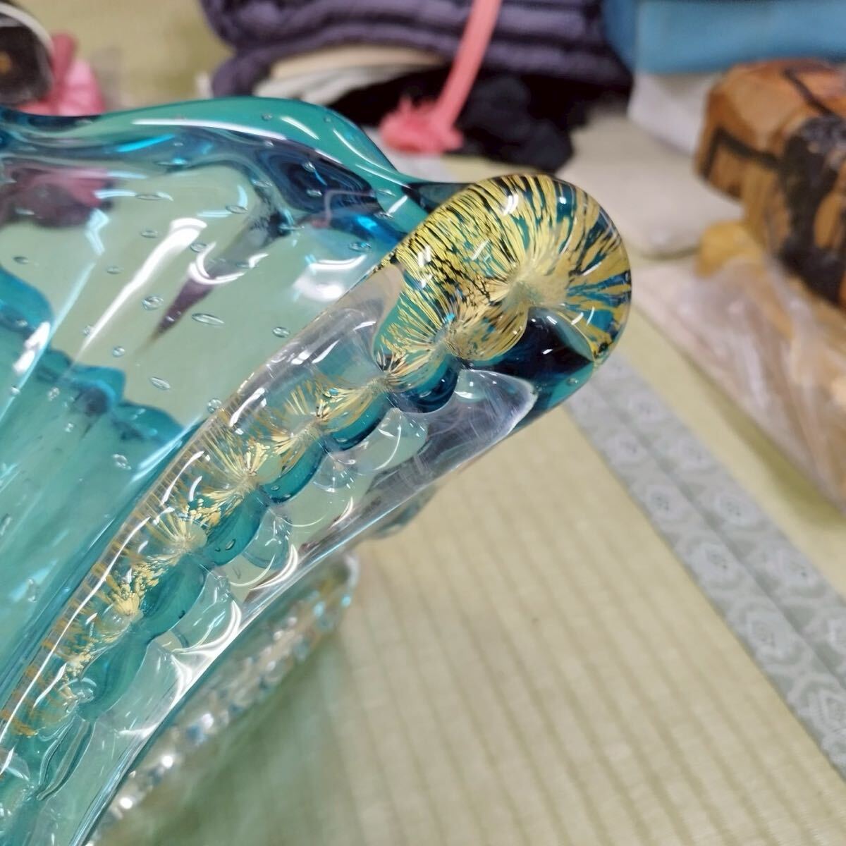 戸05b 青ガラス 花瓶 クリスタル 色被せ 花器 茶道 花道 生花 池坊 自由花 モダン 近代美術 海 波 抽象的 オブジェ フラワーベース