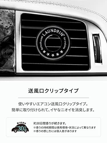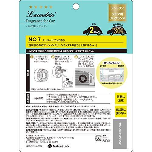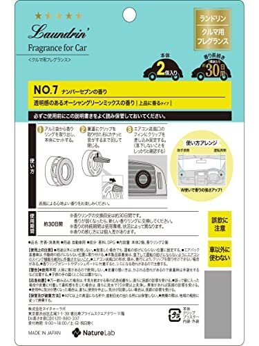 説明 商品紹介 こだわりの香りで車内を演出する車用フレグランス。どんな車にも似合うスタイリッシュなデザインと心地よい上品な香りで、ワンランク上のカーライフを演出します。ほのかな甘みと透明感のあるオーシャングリーンミックス「No.7」の香り。お得な2個セットです。 ●約30日間香りが続く※ ●送風口用クリップタイプ ●嫌なニオイを消臭 ※香りの持続期間は使用環境、状況によって異なります。 ※香りの感じ方には個人差があります。 ※パッケージデザイン等は予告なく変更されることがあります・使用上の注意 【使用上の注意】●用途以外には使用しない。●運転席側のエアコン送風口には取りつけない。●脱落した場合でも、運転の妨げにならない位置に固定する。●エアバック装着車は、作動時の妨げにならない位置に取り付ける。●本製品装着後は、落下して運転の妨げにならないようにエアコンのスイング機能を絶対に作動させないこと。●エアコン送風口の形状、厚み、奥行により、クリップを取り付けできない場合がある。●香りリングがシートやダッシュボードに付着すると、シミになる恐れがあるので注意する。【警告】●飲用不可:人体に害があるので飲用しない。●皮膚の弱い方は、かぶれる恐れがあるので装着時は手袋をするなど注意する。●子供の手の届く所には置かない。・原材料・成分 香料、DPG