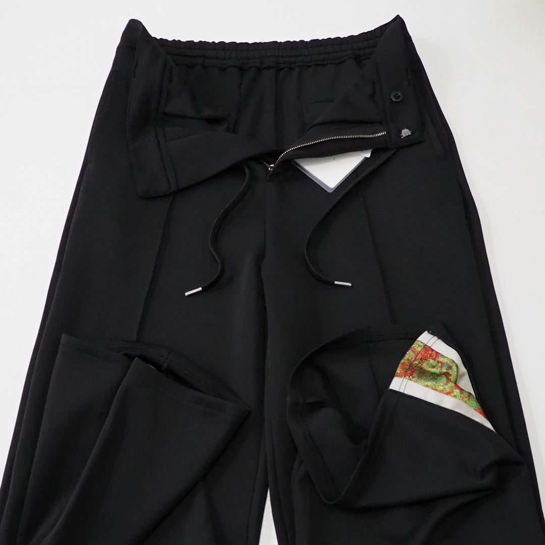 キメが細かいジャージ素材を使用し、サイドのジップの開け閉めでシルエットが変わる2way仕様、動きやすいストレッチ、ウエストのゴム&ドローコード、4ポケットなど、細部まで凝ったデザインです。