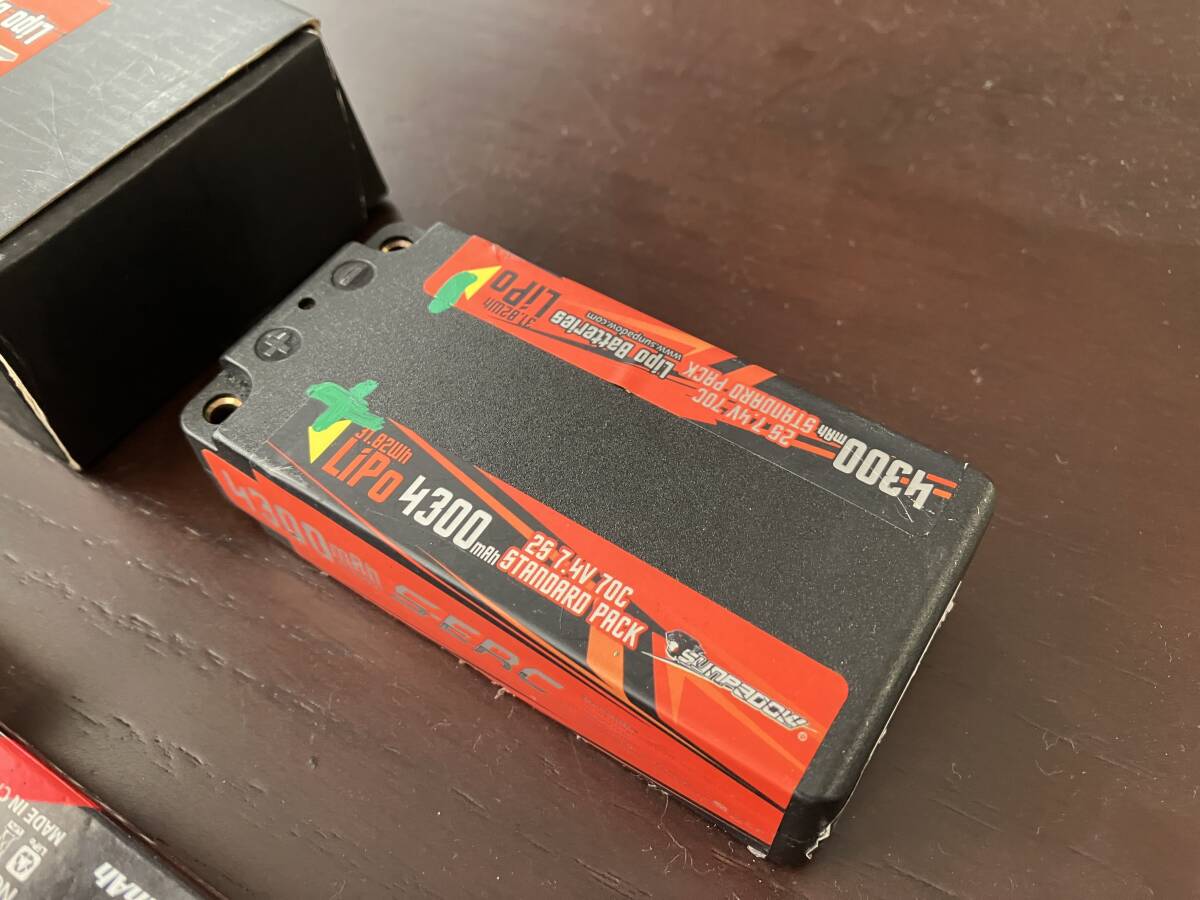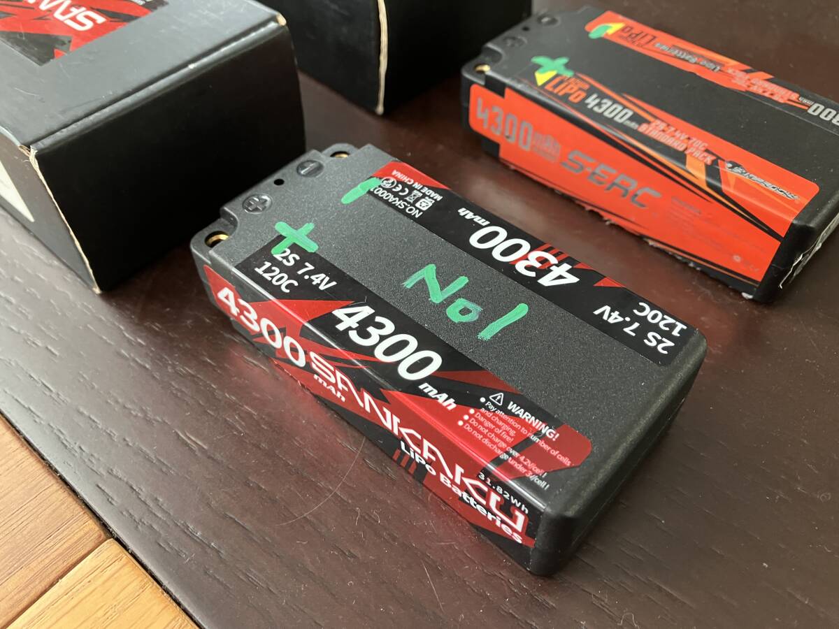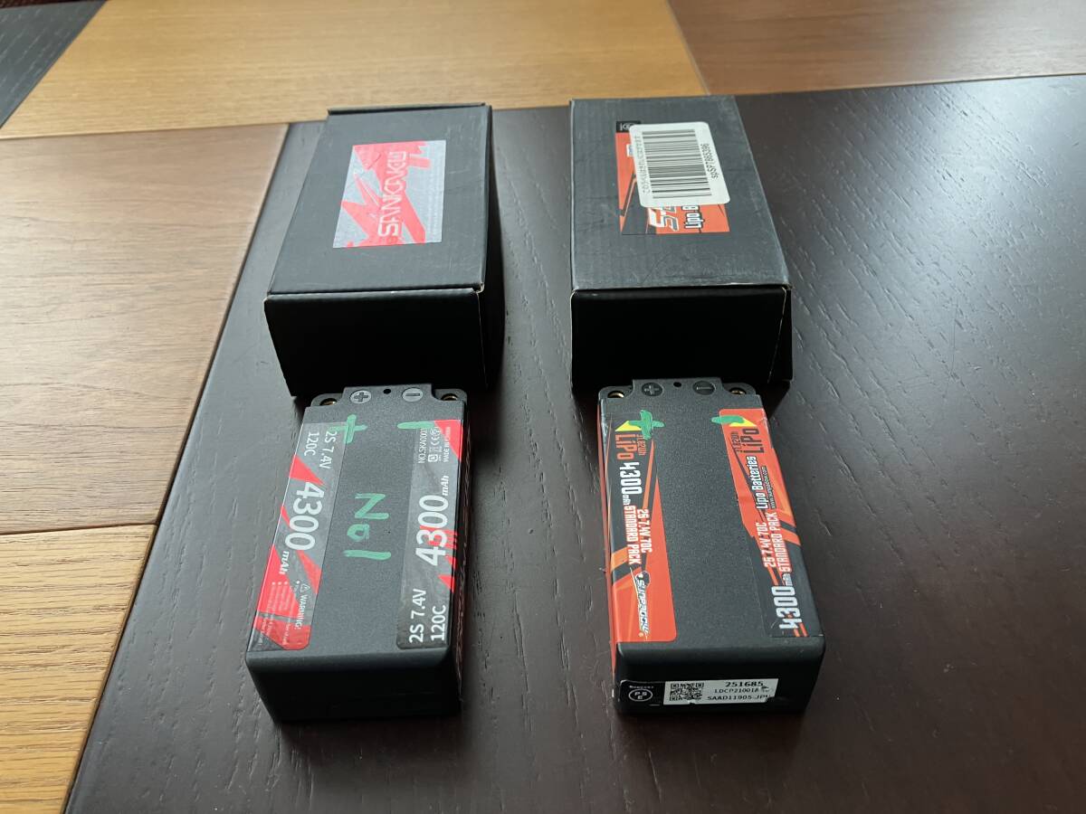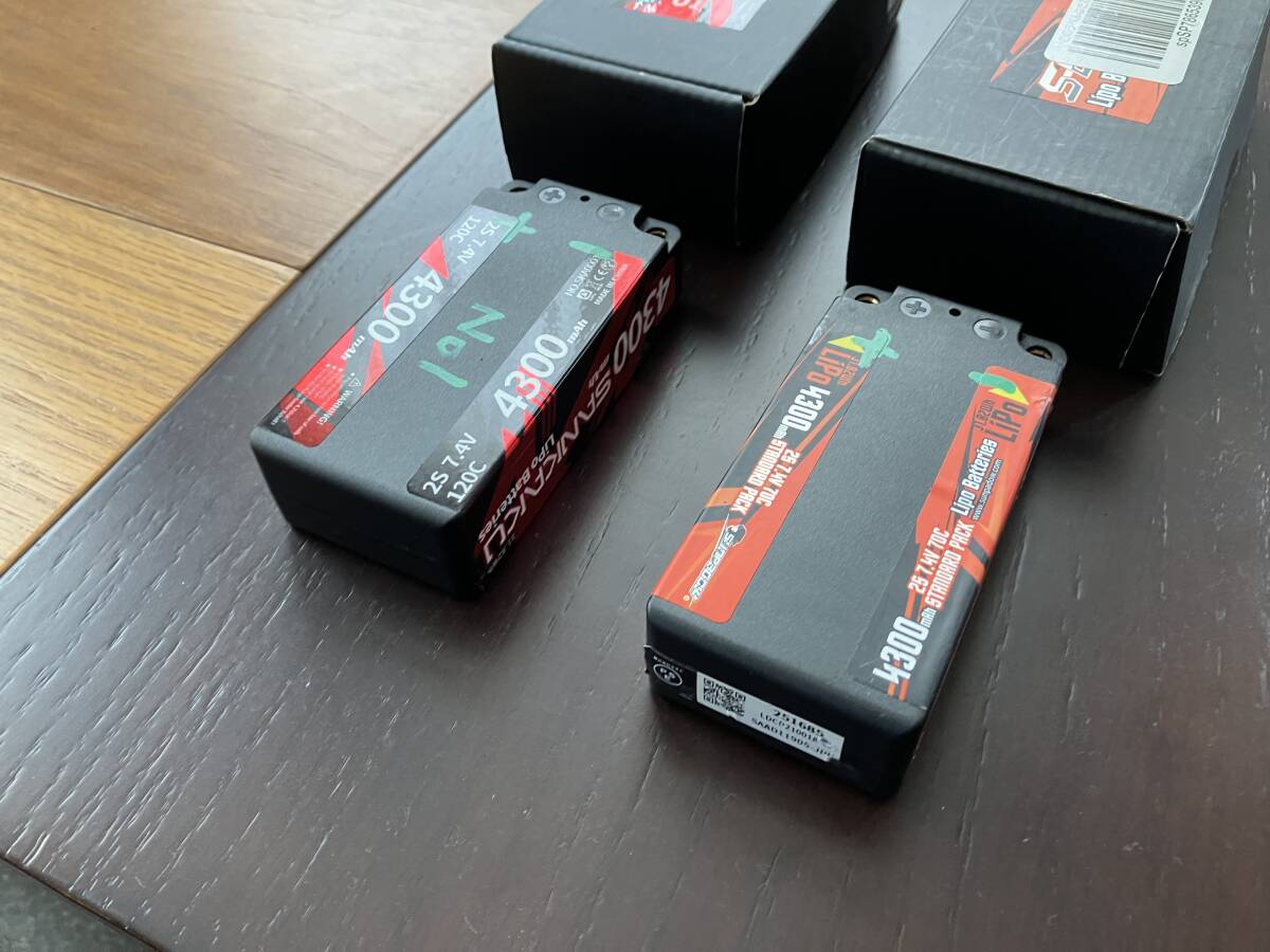 SUNPADOWの4300mah70CのバッテリーとSANKAKUの4300mah120Cのバッテリーです