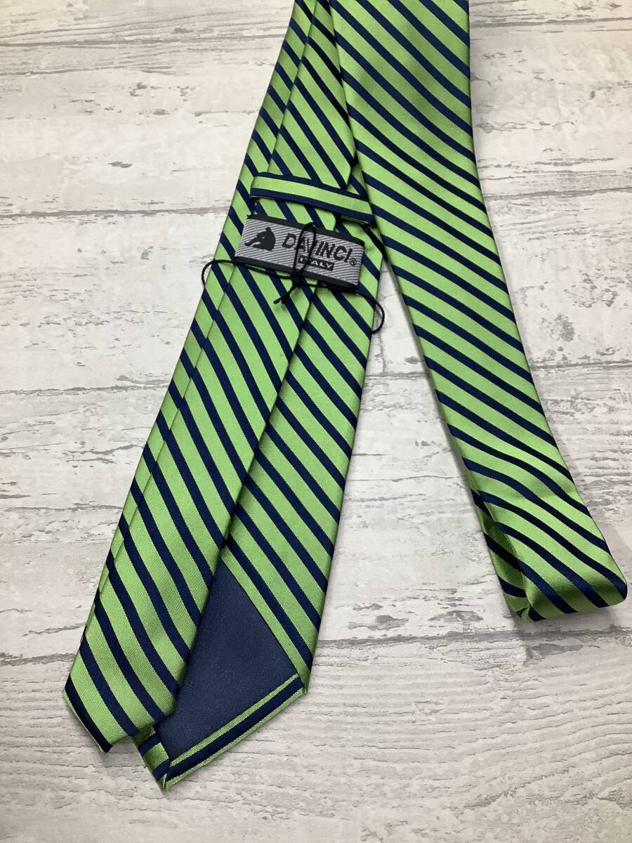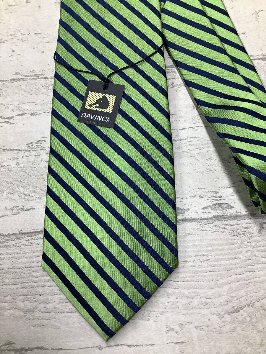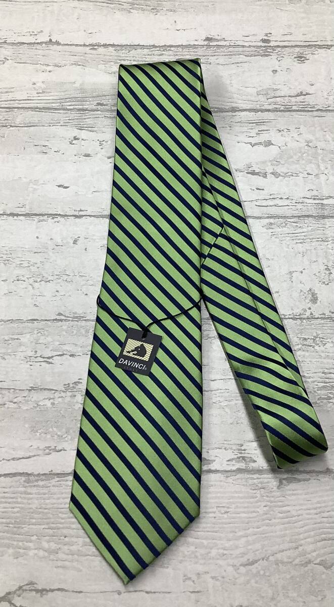 新品未使用★DAVINCI ダヴィンチ シルク100%ネクタイ グリーンベース 紺ライン 逆ストライプ 少し長い目サイズ