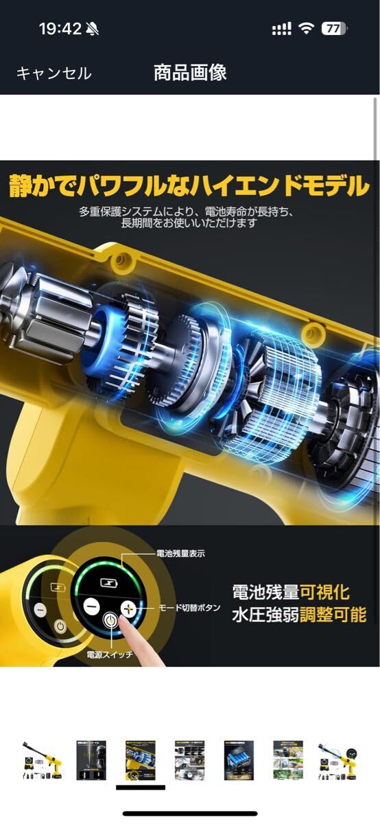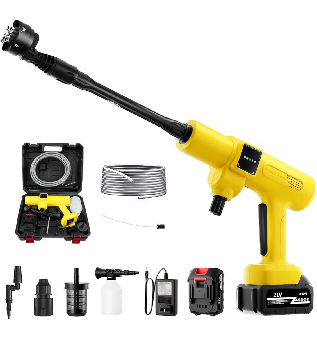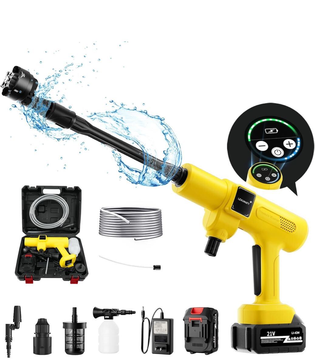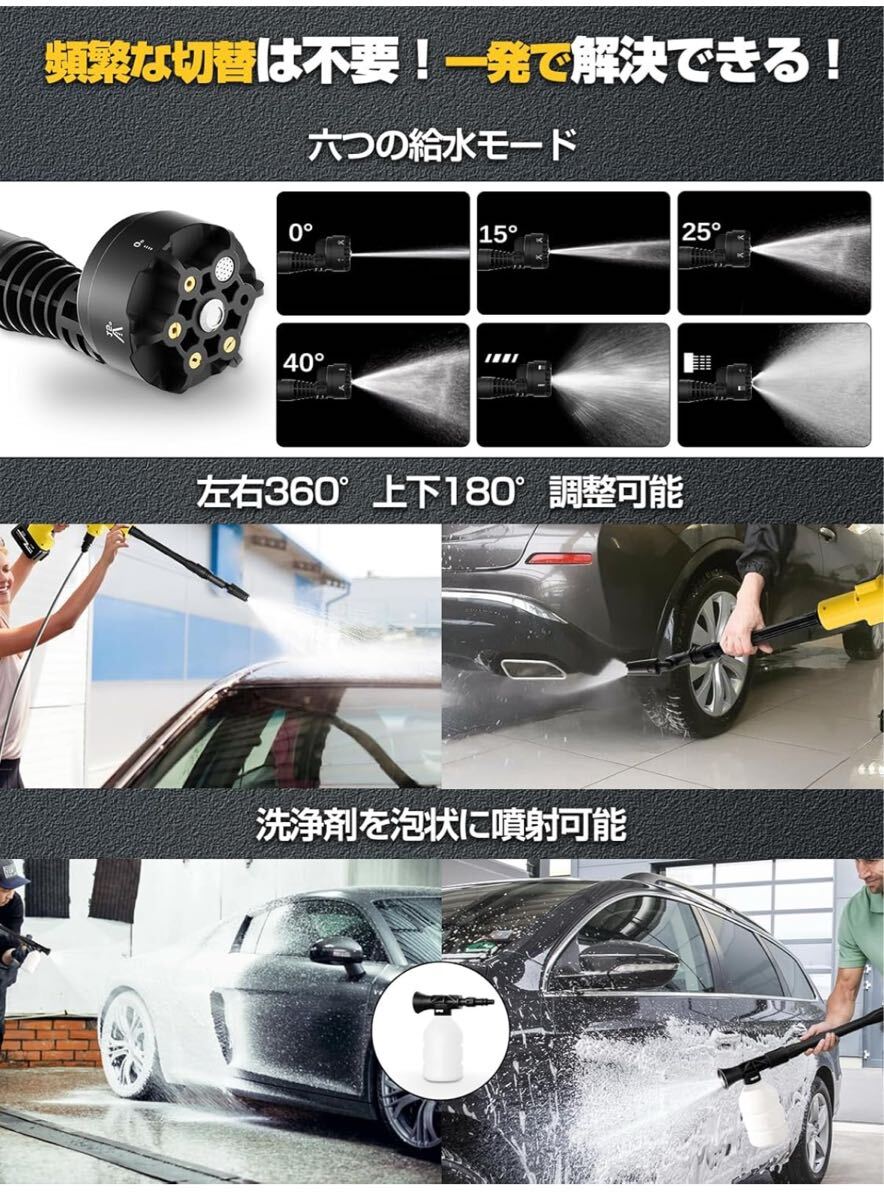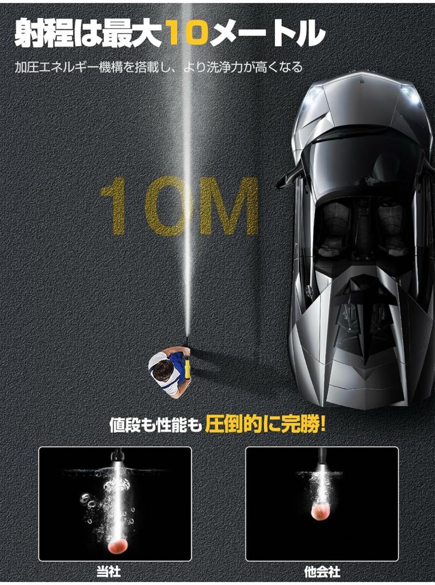 洗車店監修の本格仕様!750Wの強力モーターとマキタ互換20,000mAh大容量バッテリーで、屋外や水道のない場所でもパワフル洗浄が可能です。噴射距離は最大10m、自吸式だからバケツの水からでも給水OK。収納ケース付きで持ち運びもラクラク。