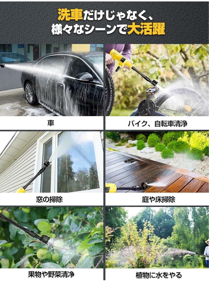 洗車、庭・外壁・ベランダ・玄関・階段・ガラス・ブロック塀、浴室の掃除、年末の大掃除、キャンプ用品の洗浄など幅広く活躍します。