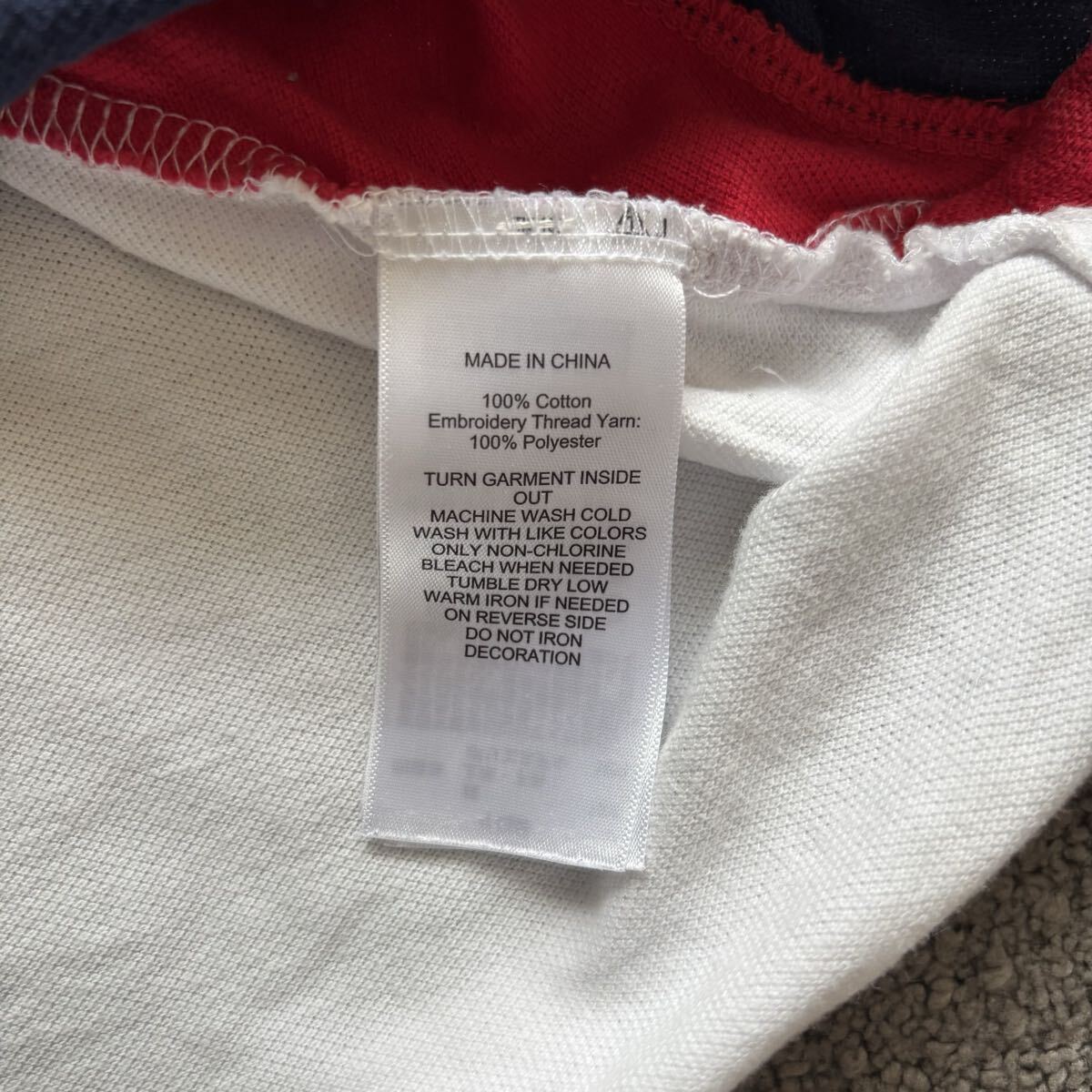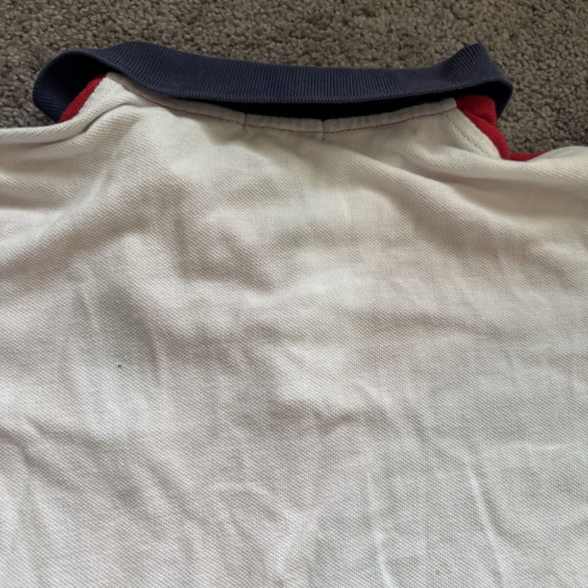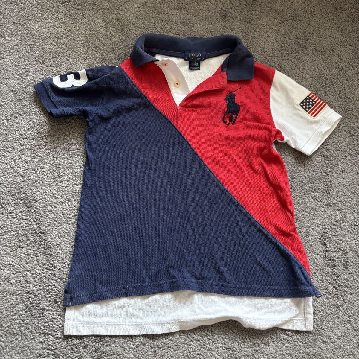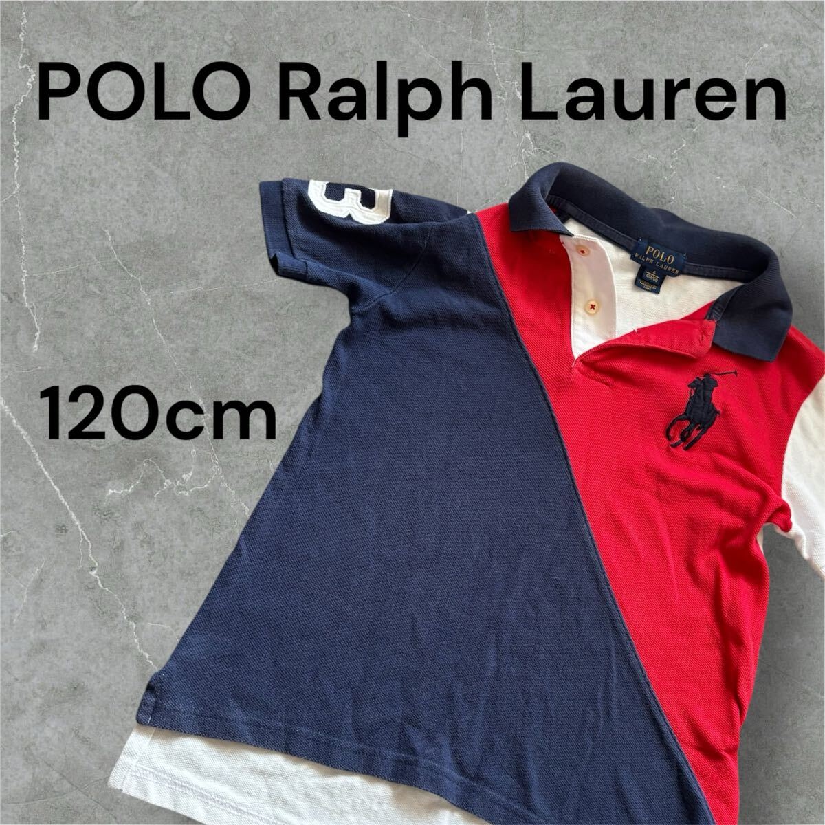 赤と紺のバイカラーで、袖に数字3の刺繍が施されたキッズ用のポロシャツ。