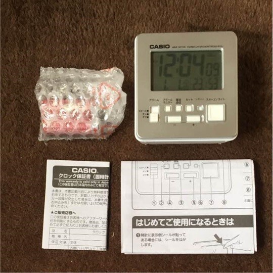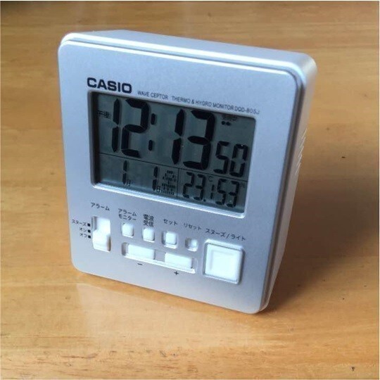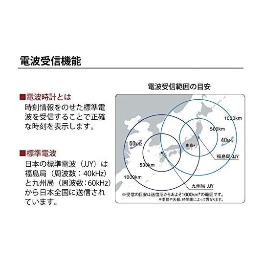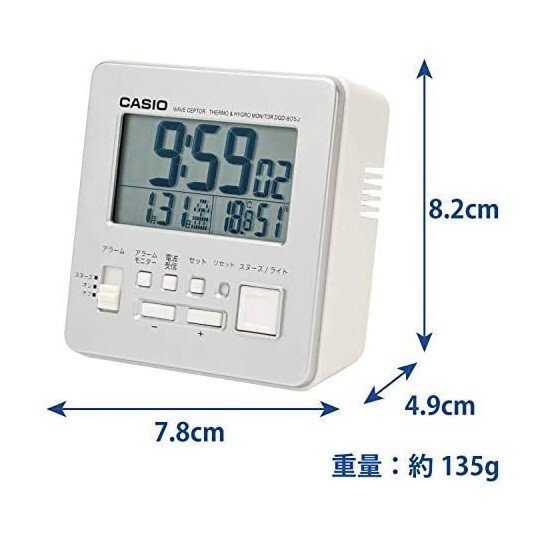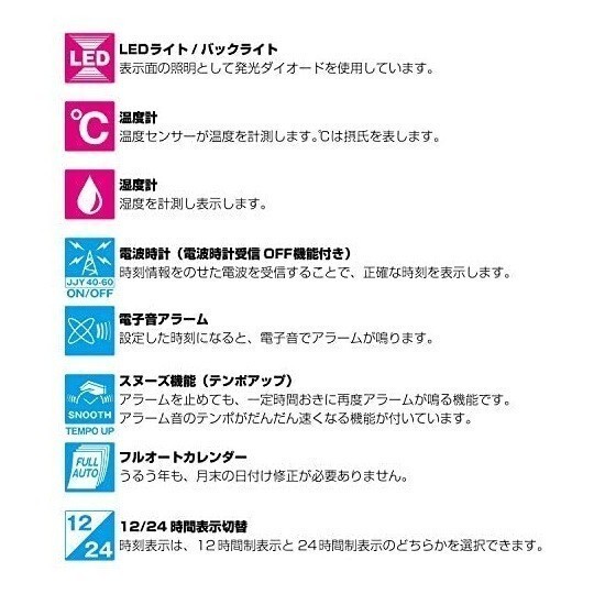 機能:電波受信機能 (自動受信/手動受信)、電波受信ONOFF機能、温度表示、湿度表示、電子音アラーム、スヌーズ機能、カレンダー表示、LEDライト (残照機能付き)、12/24時間制表示切替電源:単3形マンガン乾電池×2本 (電池寿命約1年)