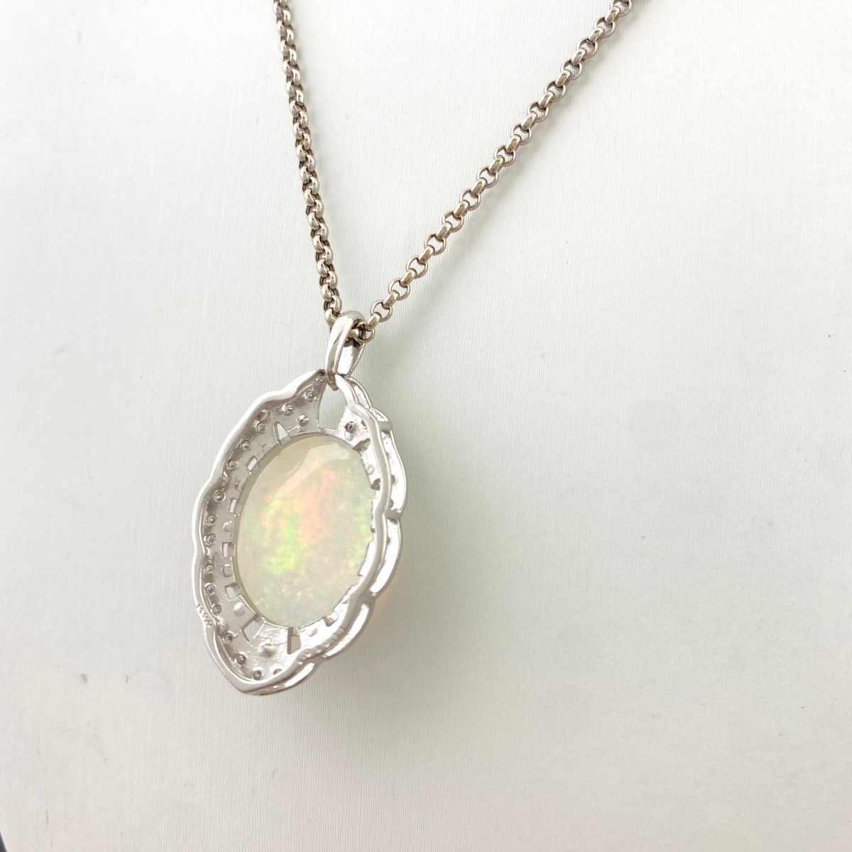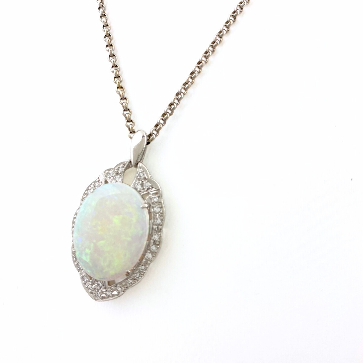 オパール:6.09ct、メレダイヤ:0.30ct トップ:Pt900、チェーン:K18WG 中古品の為、若干のキズや汚れ、オパールにキズがございます。 |