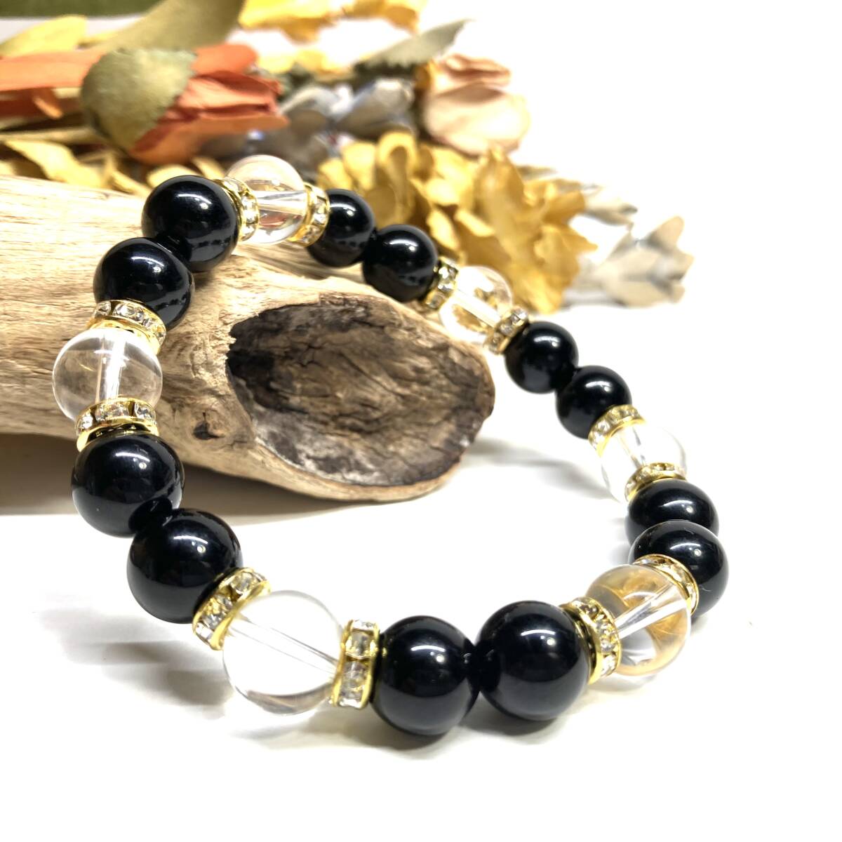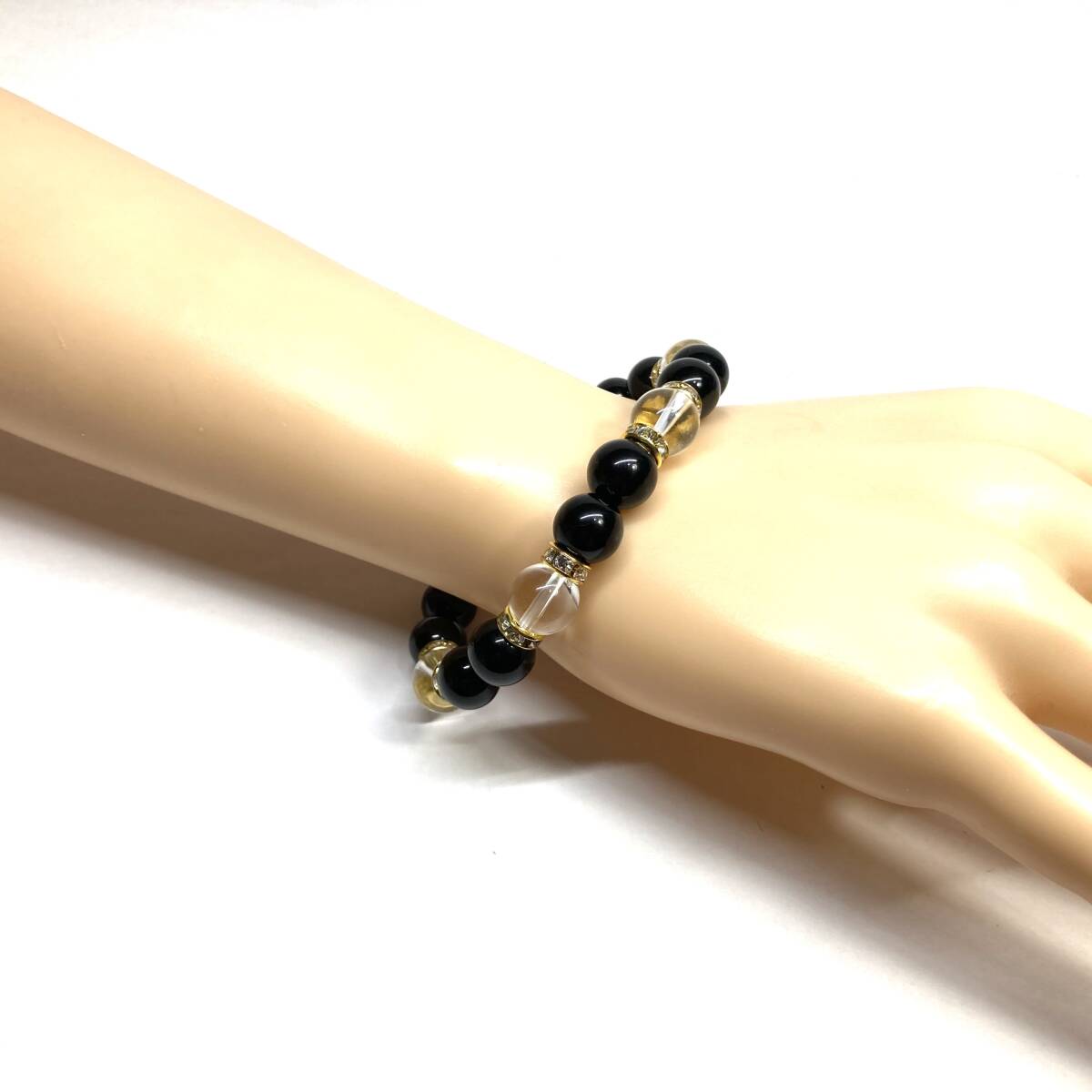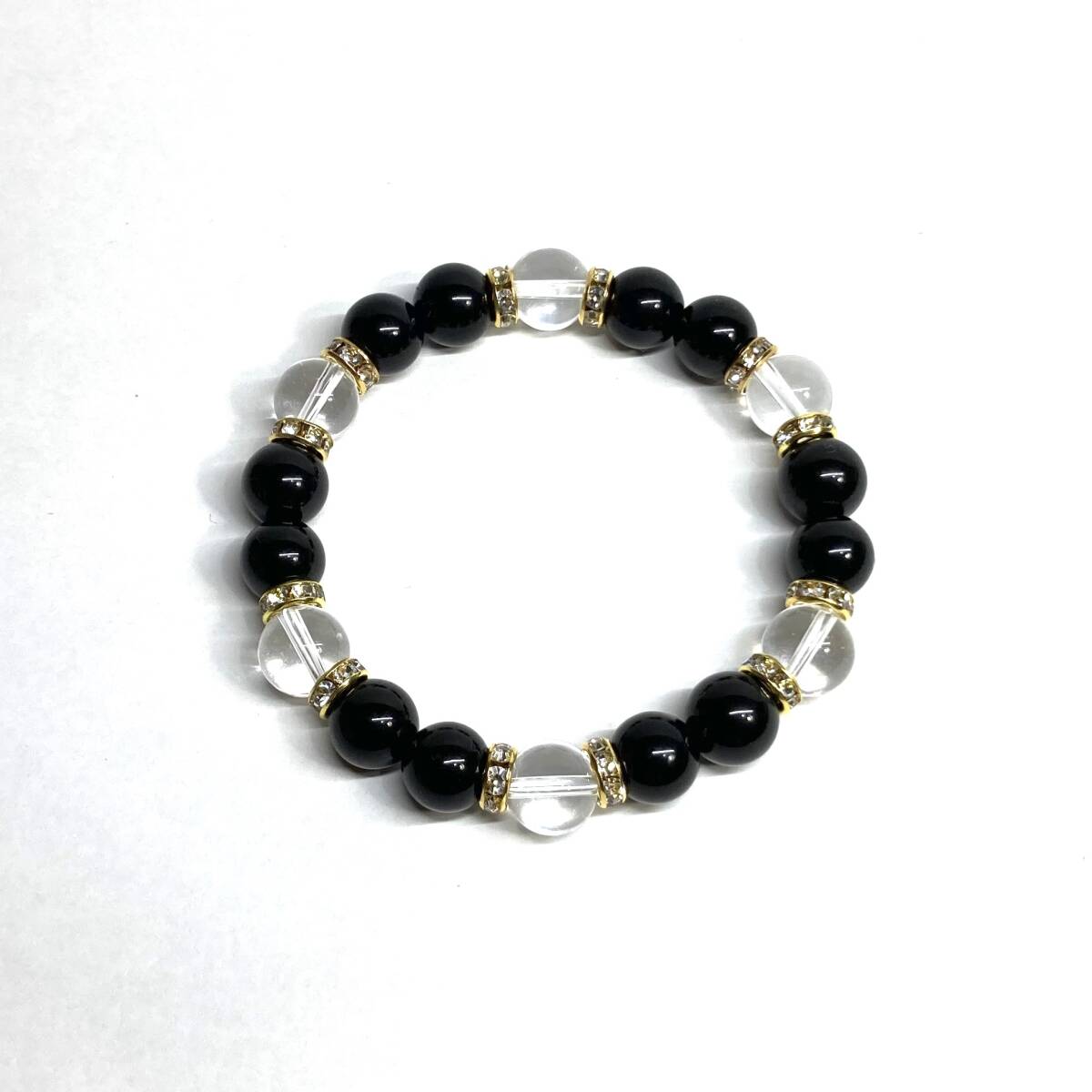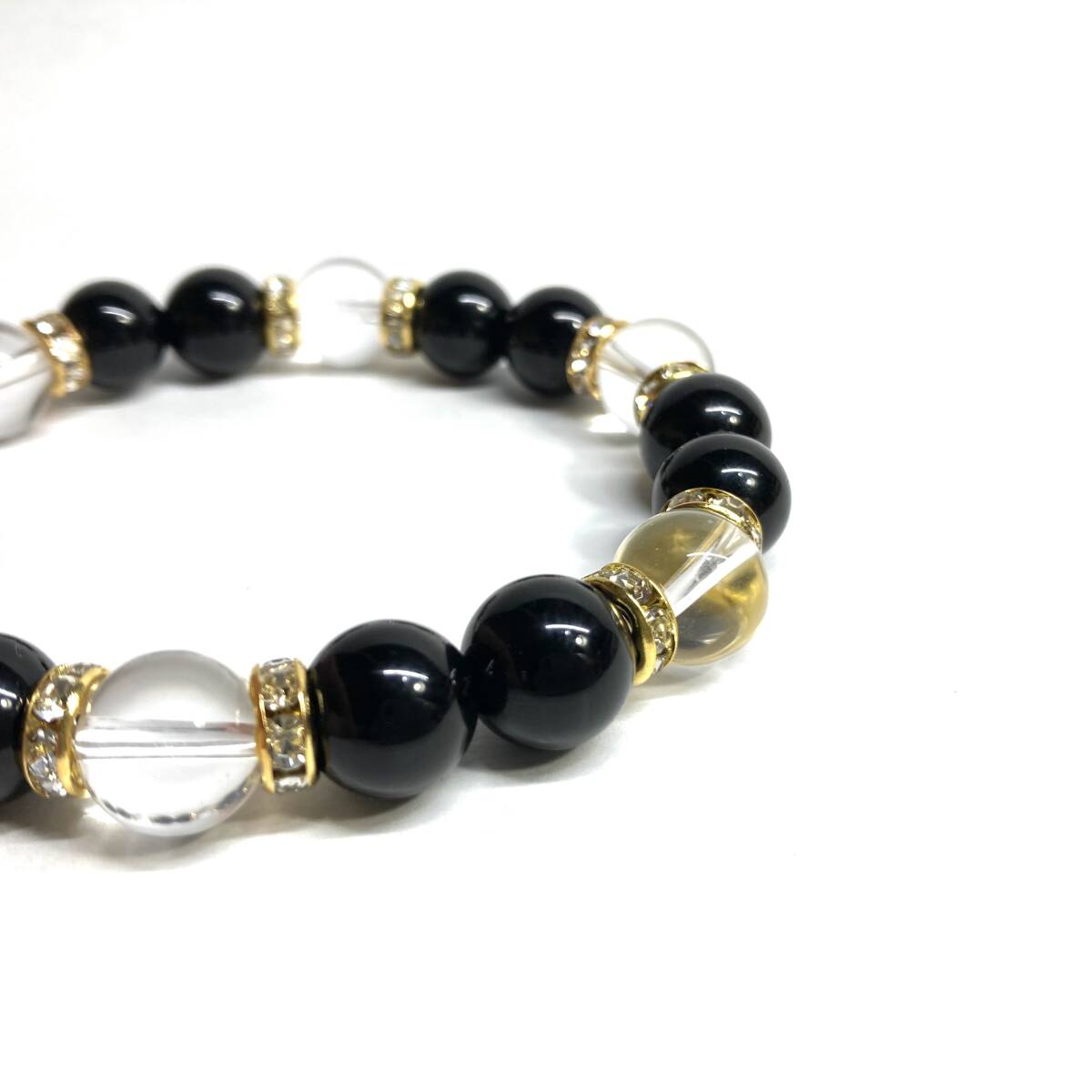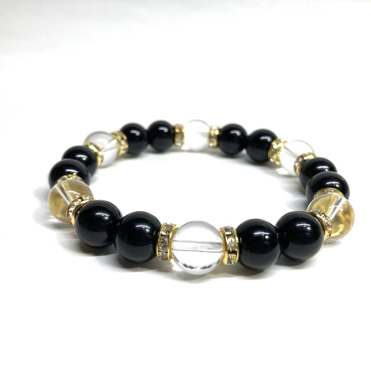 こちらは、モリオンと水晶を組み合わせたパワーストーンブレスレットです。間にはロンデルを挟み高級感あるデザインに仕上げております。石大きさは腕にも馴染みやすいように10mm玉で内径約18cm(伸可能)です。(サイズ変更の場合は取引ナビにてご連絡をお願いします。) 数に限りがございますので気になる方はお早めにどうぞ。