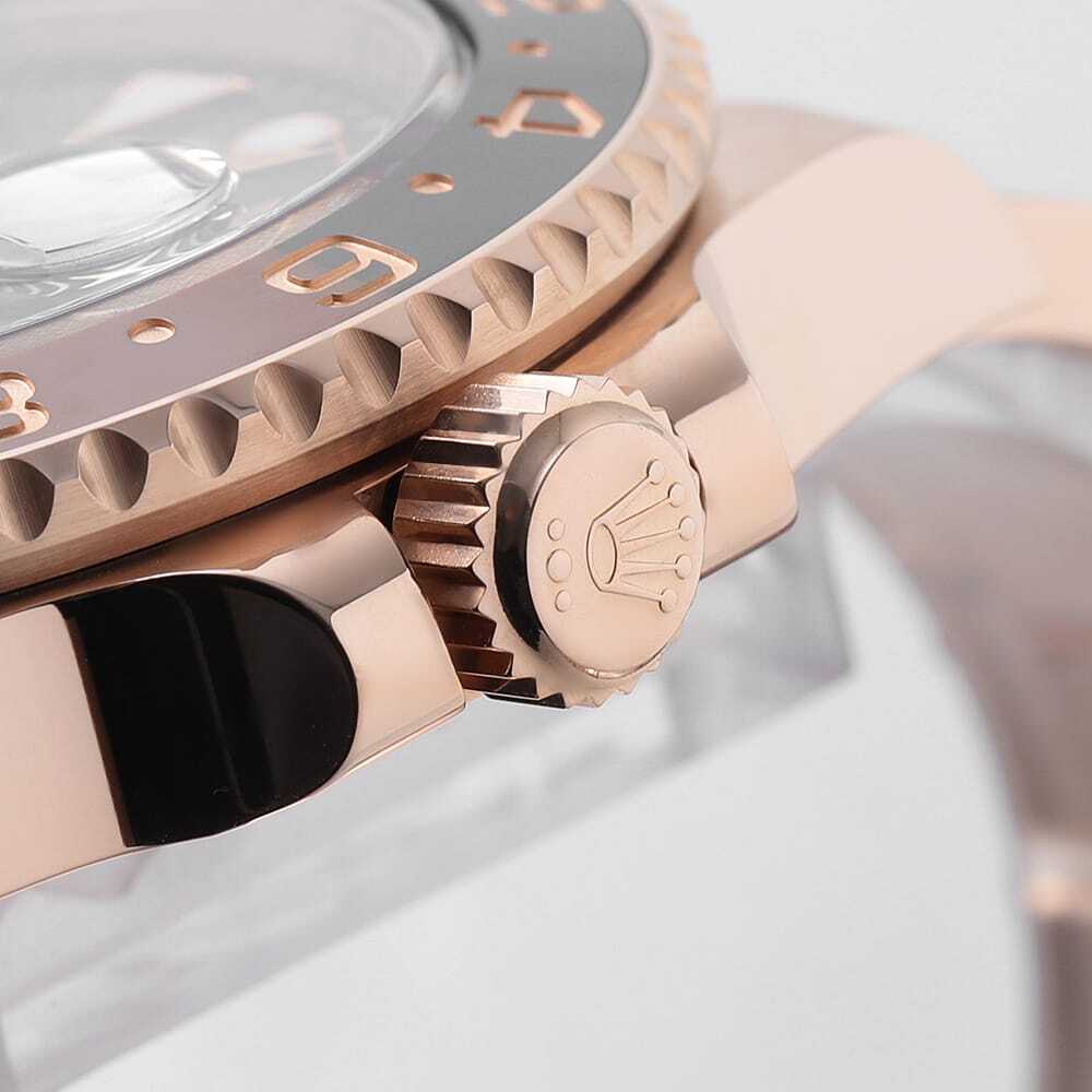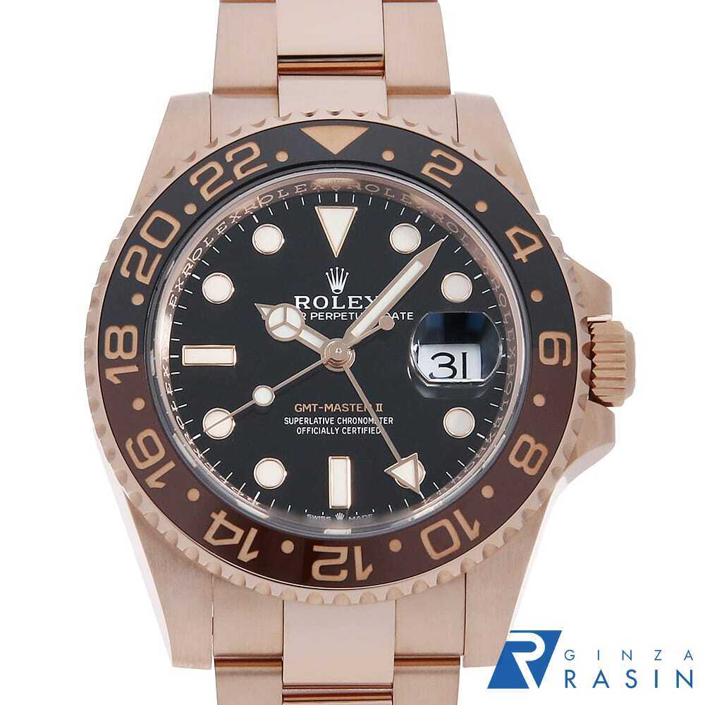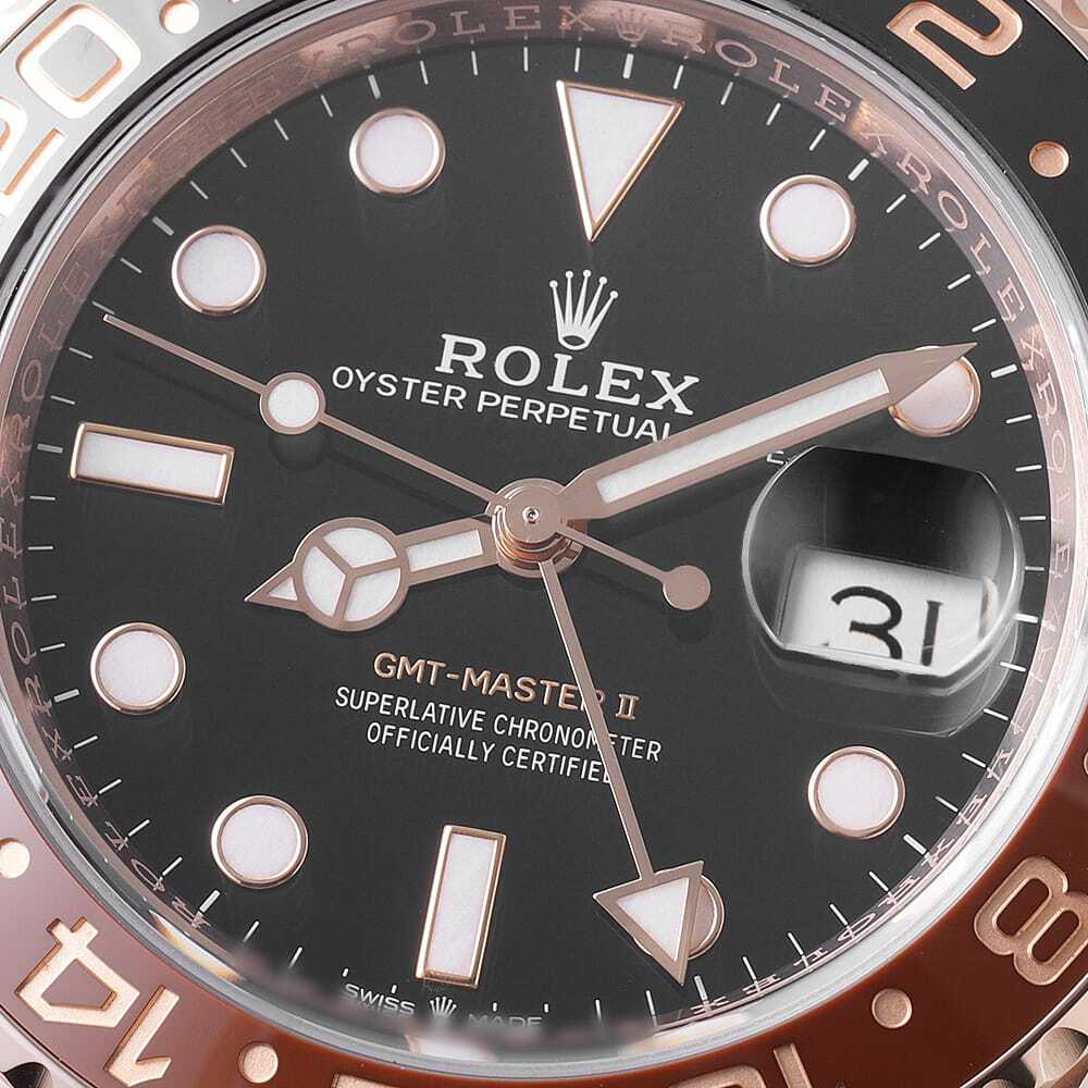 モデル情報 | バーゼルワールド2018にて発表されたGMTマスターIIが入荷しました。こちらは、エバーローズゴールド製ボディにブラック/ブラウンベゼルがとにかく美しい一本です。GMTマスターは過去様々な色合いのベゼルがラインナップされてきましたが、ブラウンはゴールドモデルにのみ使われる特別な色合い。独自技術のセラクロムによって、高級感が押し上げられることとなりました。外装の素晴らしさもさることながら、ムーブメントは新型Cal.3285を搭載したことにより、パワーリザーブ約70時間。高い信頼性・メンテナンス性と、最先端スペックを獲得しています。40mmケースの防水性は100m。 |