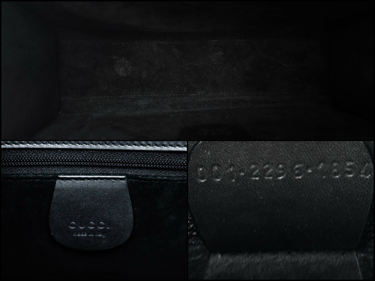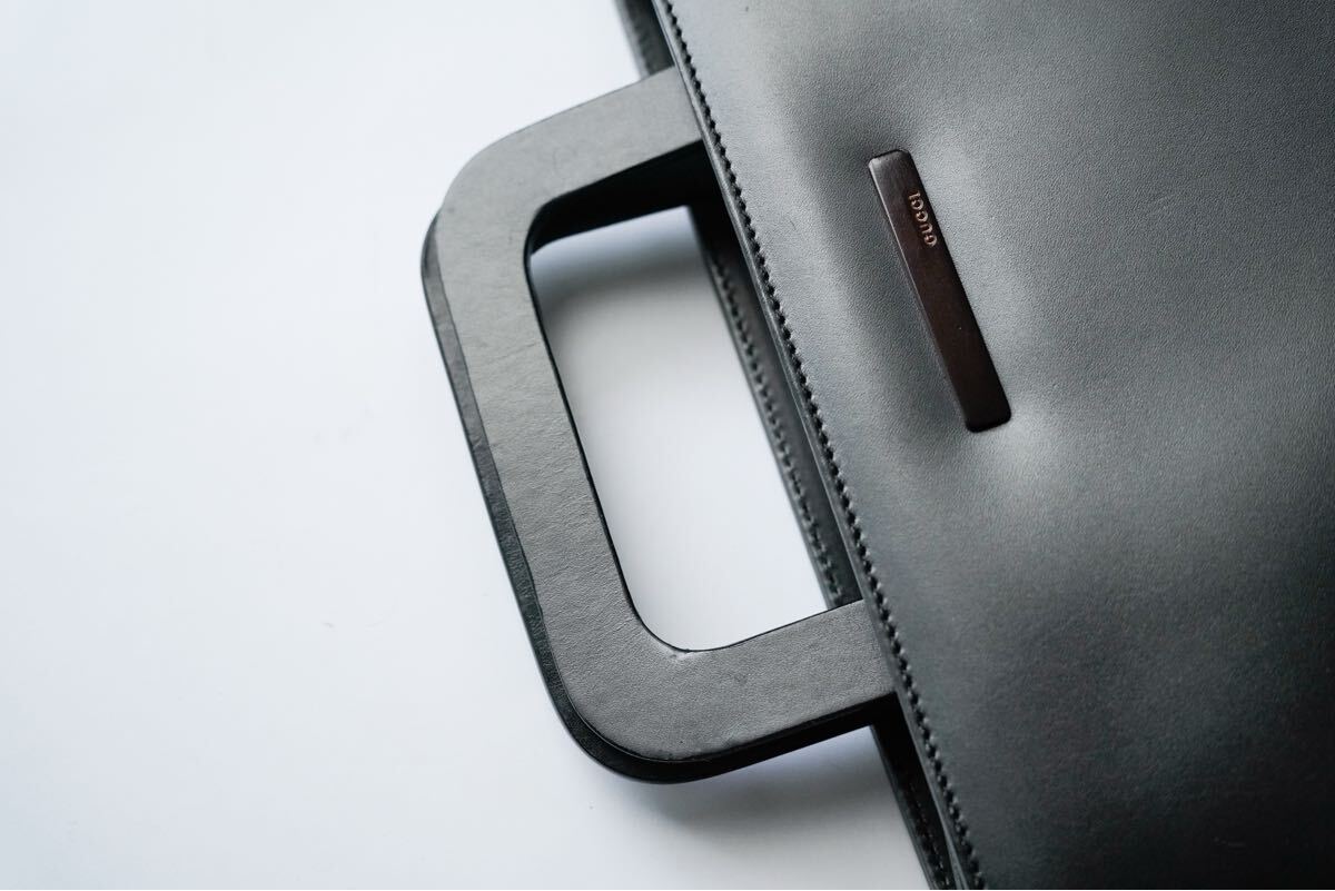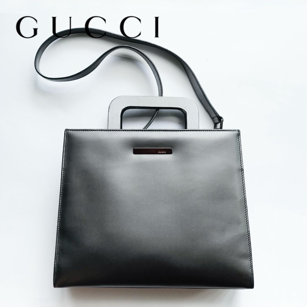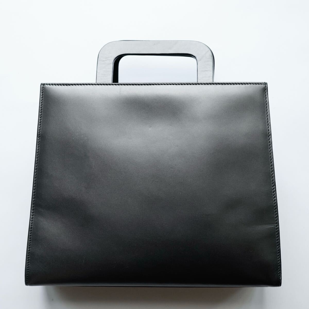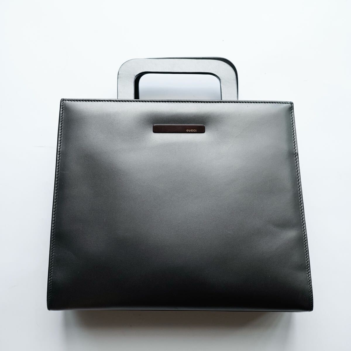 マットな質感のブラックレザーに、シャープなスクエアフォルムを描いたモダンなデザイン。最大の特徴はウッド調のスクエアハンドルで、当時のGUCCIが追求した建築的で官能的な美学を体現しています。