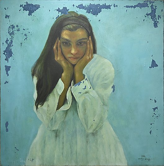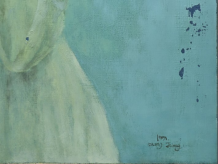 【 Zhang Jiang 張江「思索にふける」油彩 サイン入 S20 1991年 y090308 】油絵 人物画 美人画 中国画家