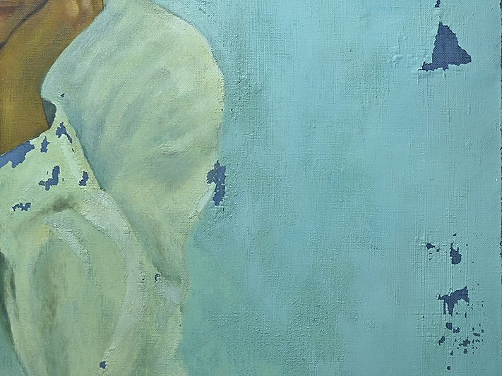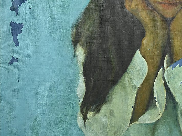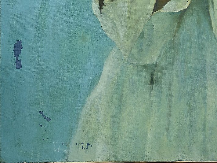 油絵の剥離、キャンバスの背面の木枠が外れています。他状態は良好です。