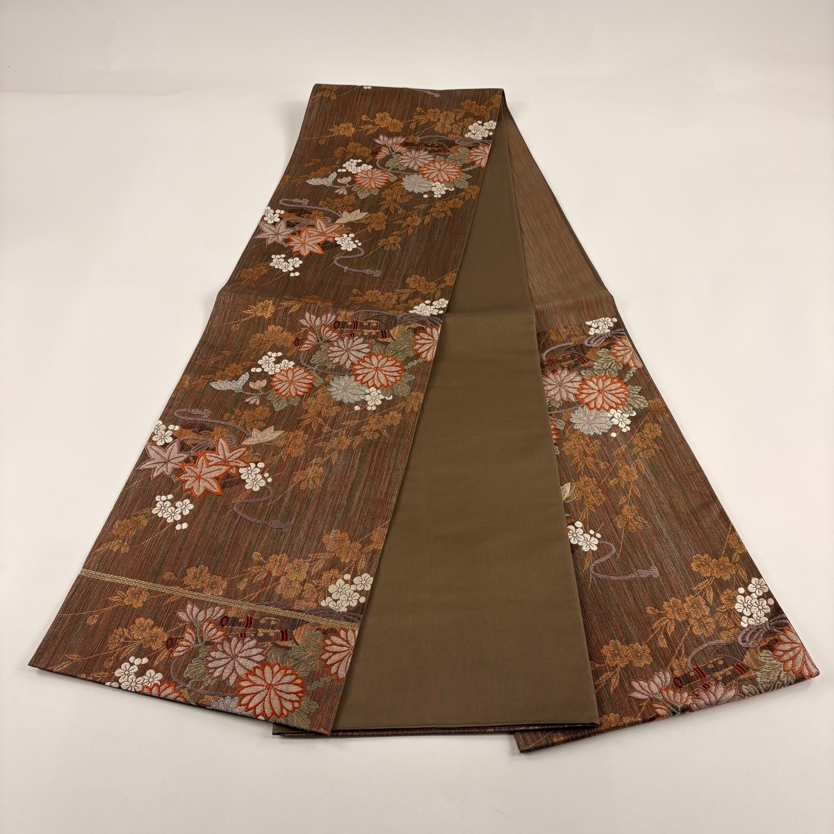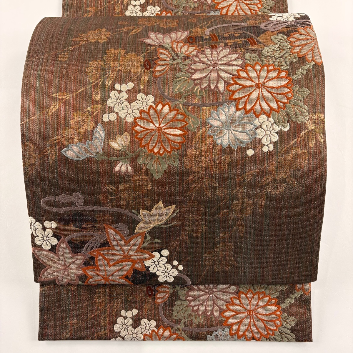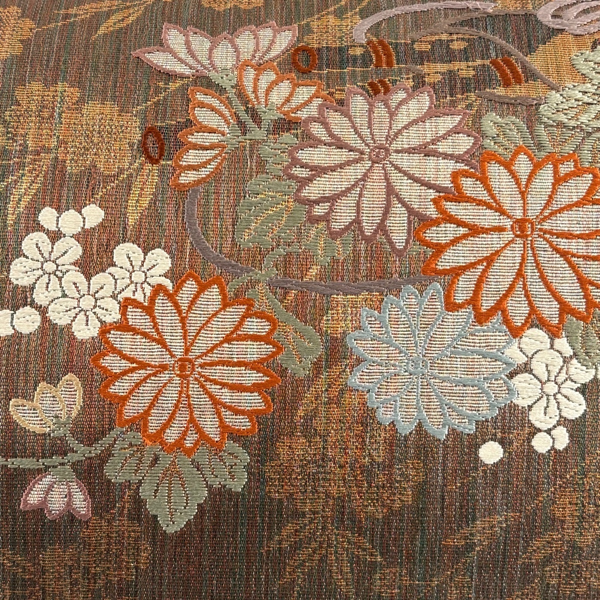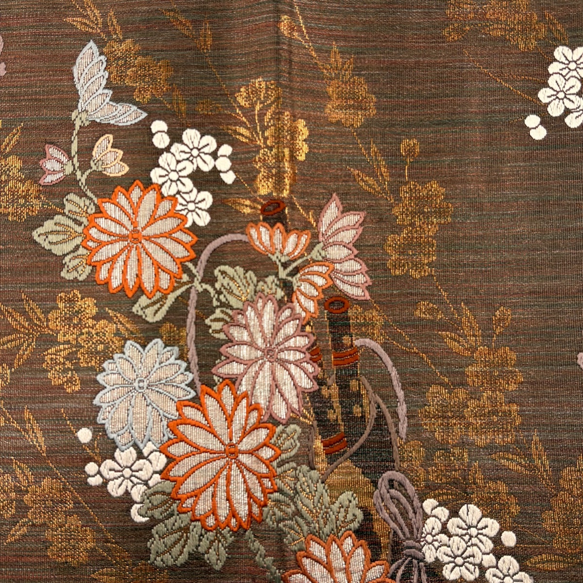 | 袋帯 美品 秀品 菊 笛 刺繍 箔 焦茶色 六通 正絹 【中古】 |