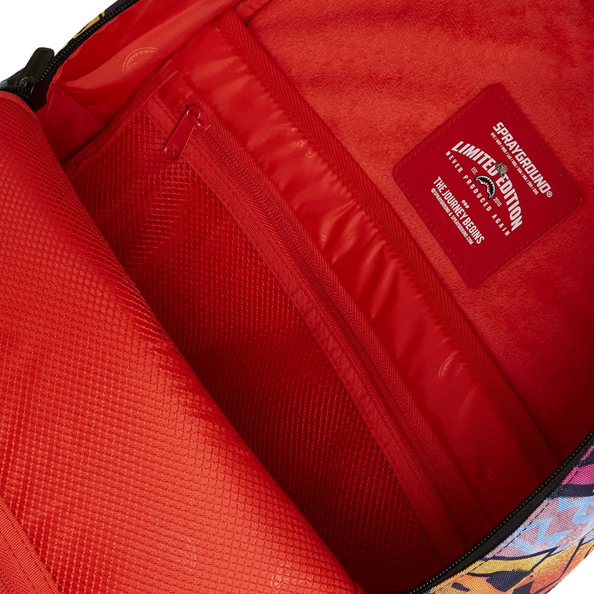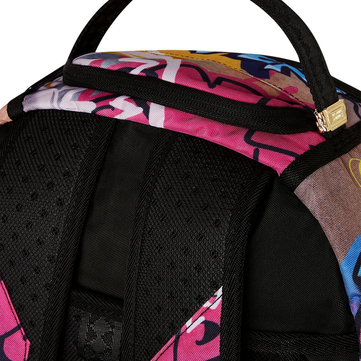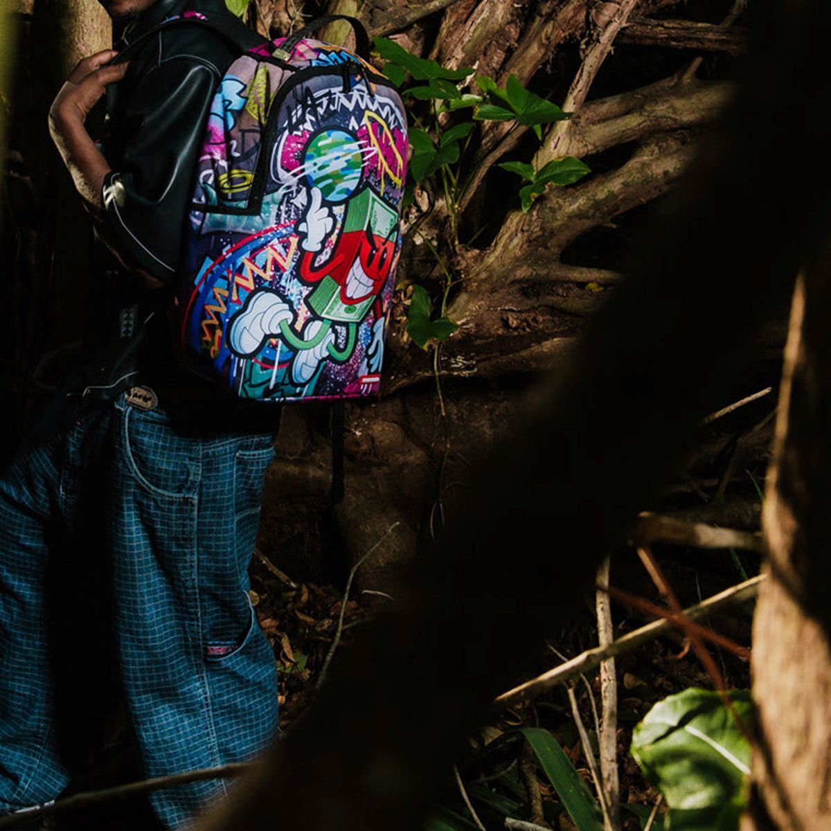 ・未来的でエネルギッシュな背景に、ドル札やカラフルな惑星などのイラストが散りばめられたグラフィックとストリートアートが融合した見た目にも楽しバックパック