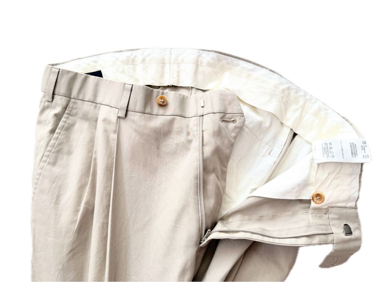 ツータックに股上深く立体的なウエスト、ヒップ周りから裾(24センチ)に向かってゆったりテーパードしたドレープの美しいシルエットは穿いた時に脚を綺麗に見せてくれます。