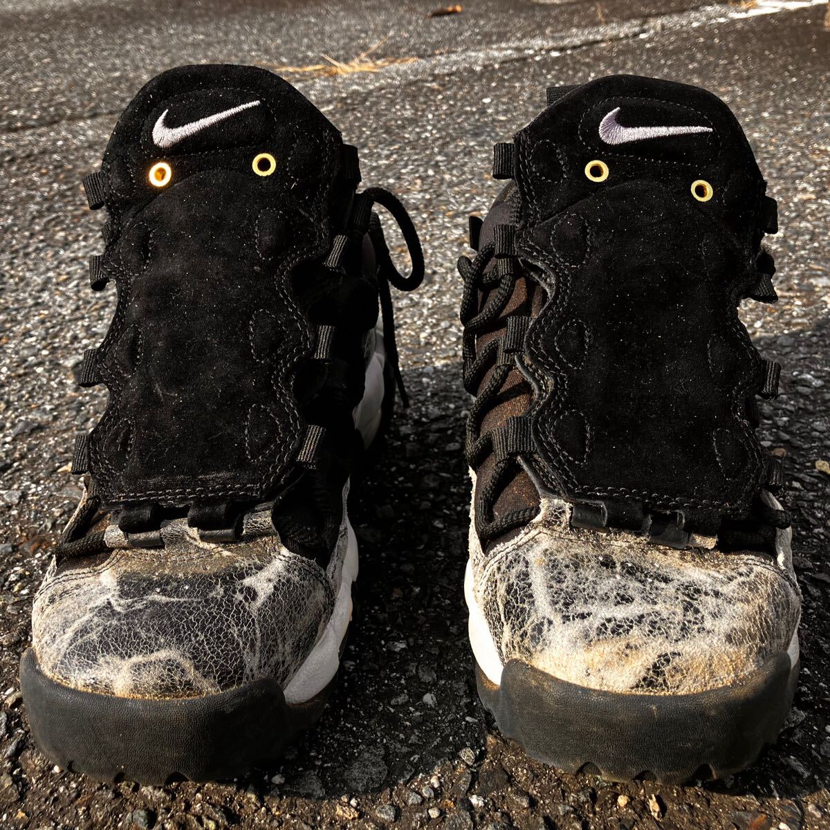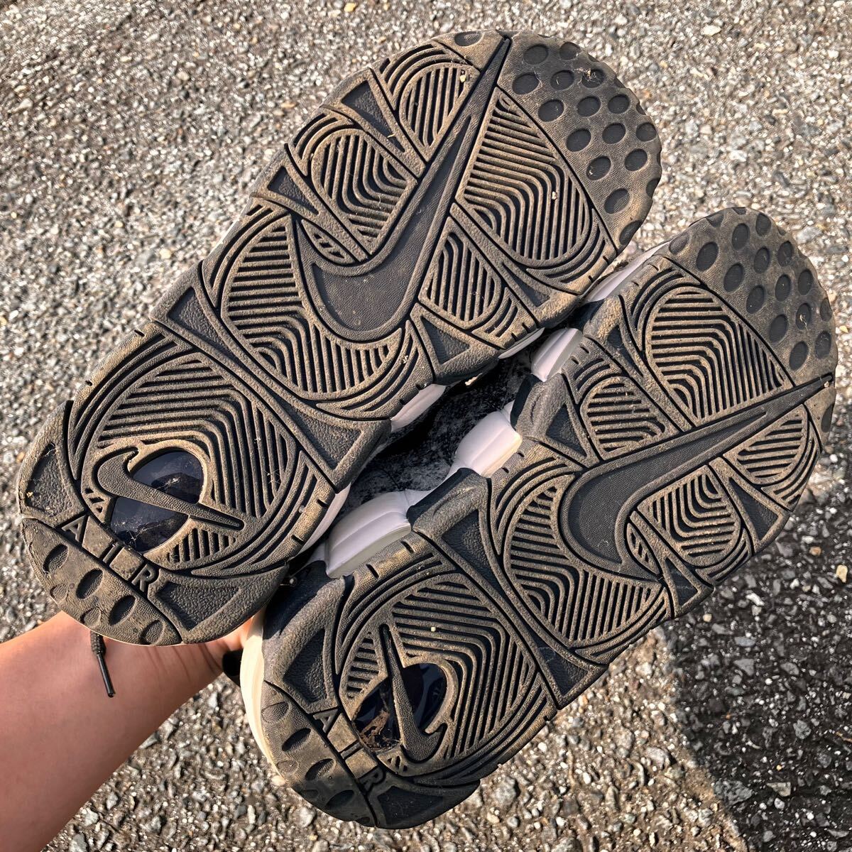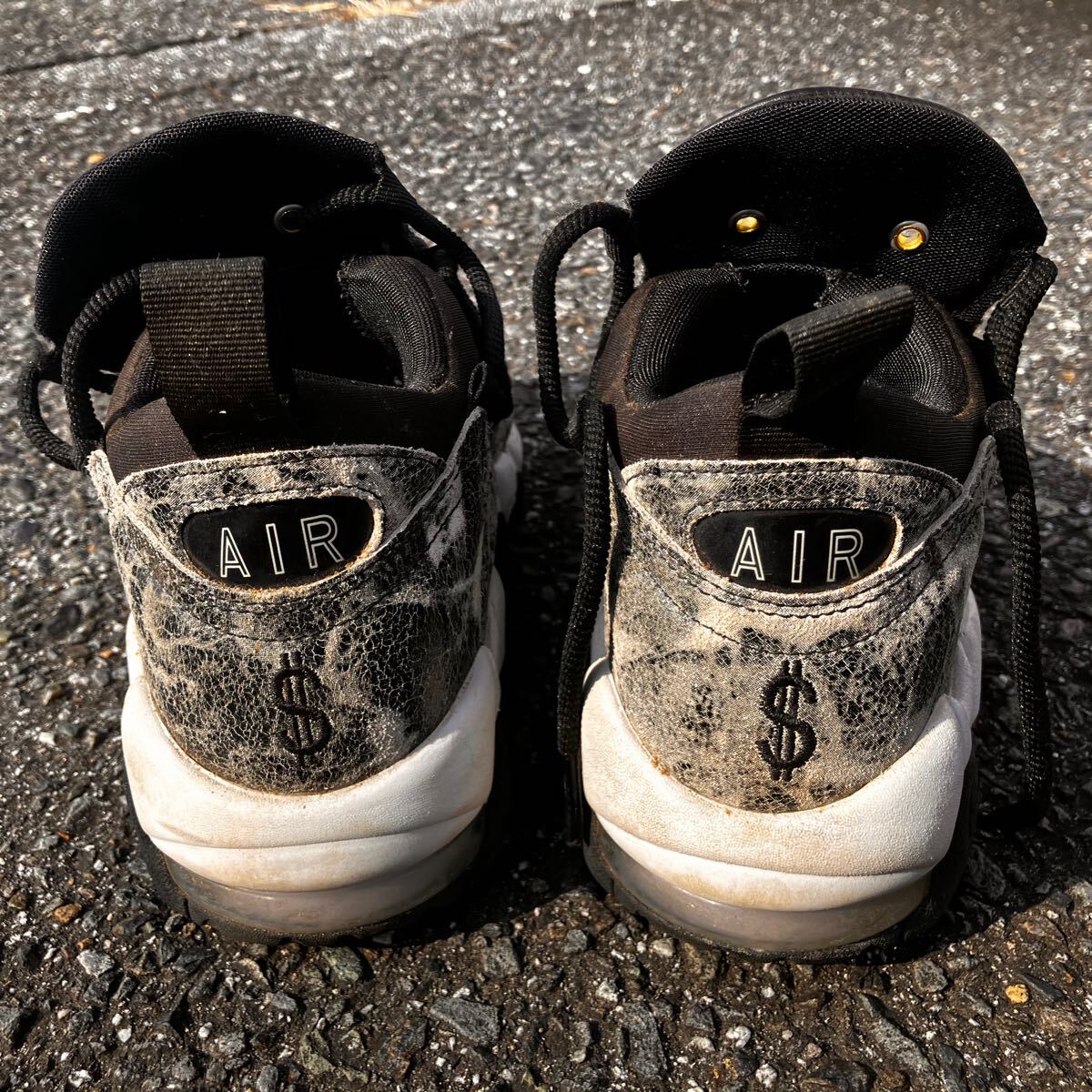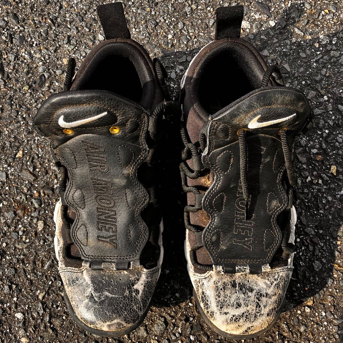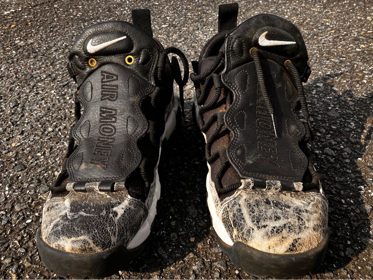 こちらはNIKE AIR MORE MONEY LXの希少な一足です。多少の使用感はございますが、ソールの減りなどはなく、まだまだ快適にご着用いただけるコンディションです。黒と白のクラシックなカラーリングが特徴で、コレクターアイテムとしても価値のある一品です。