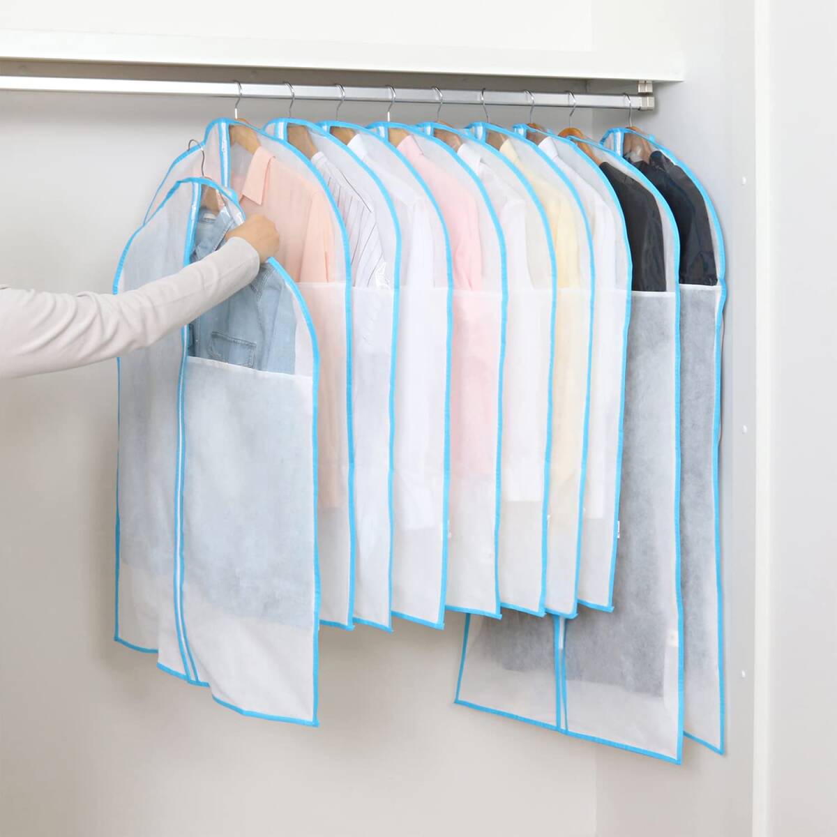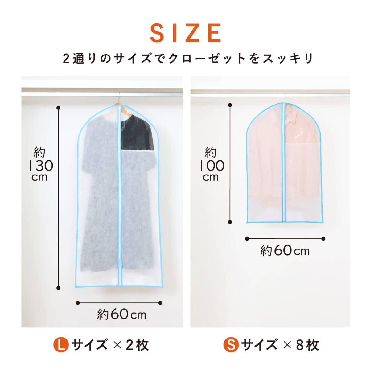 説明 商品名:ファスナー開閉カバー 水色(S8枚+L2枚) サイズ:ショートサイズ/約幅60×長さ100cm・ロングサイズ/約幅60×長さ130cm カラー:ホワイト 内容:10枚(ショートサイズ8枚・ロングサイズ2枚) 材質:ポリプロピレン 生産国:中国 【収納目安(カバー1枚あたり)】 ●ショートサイズ:ジャケット1着、ロングサイズ:コート1着 【特長】 ●通気性に優れた不織布で大切な洋服をホコリなどの汚れからガード。 ●カバーをかけて洋服を収納することで、クローゼット内がスッキリ。 ●センターファスナーで衣類の出し入れがスムーズ。下部も縫い合わせているのでホコリをシャットアウト。 ●スーツのジャケットなどに使えるショートサイズ8枚、コートなどに使えるロングサイズ2枚の10枚セット。 【ご注意】 ●洗濯はできません。 ●強く引っ張ると破れるおそれがあります。 ●直射日光に長時間当たると生地が劣化するおそれがあります。 【不織布とは】 不織布(ふしょくふ)とは、繊維を糸にして織ったり編んだりせずに、そのままシート状にした「織らない布」のことです。 通気性が良くホコリを通しにくい生地のため、衣類や寝具の収納に適しています。 アストロではスパンボンド方式で製造されたポリプロピレン製の不織布を主に使用しています。 ASTRO CO. LTD established in 1970