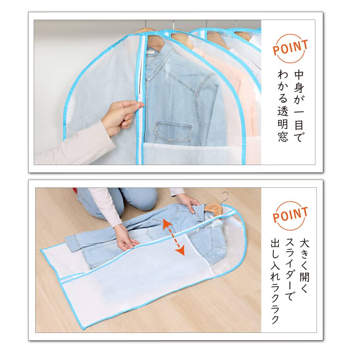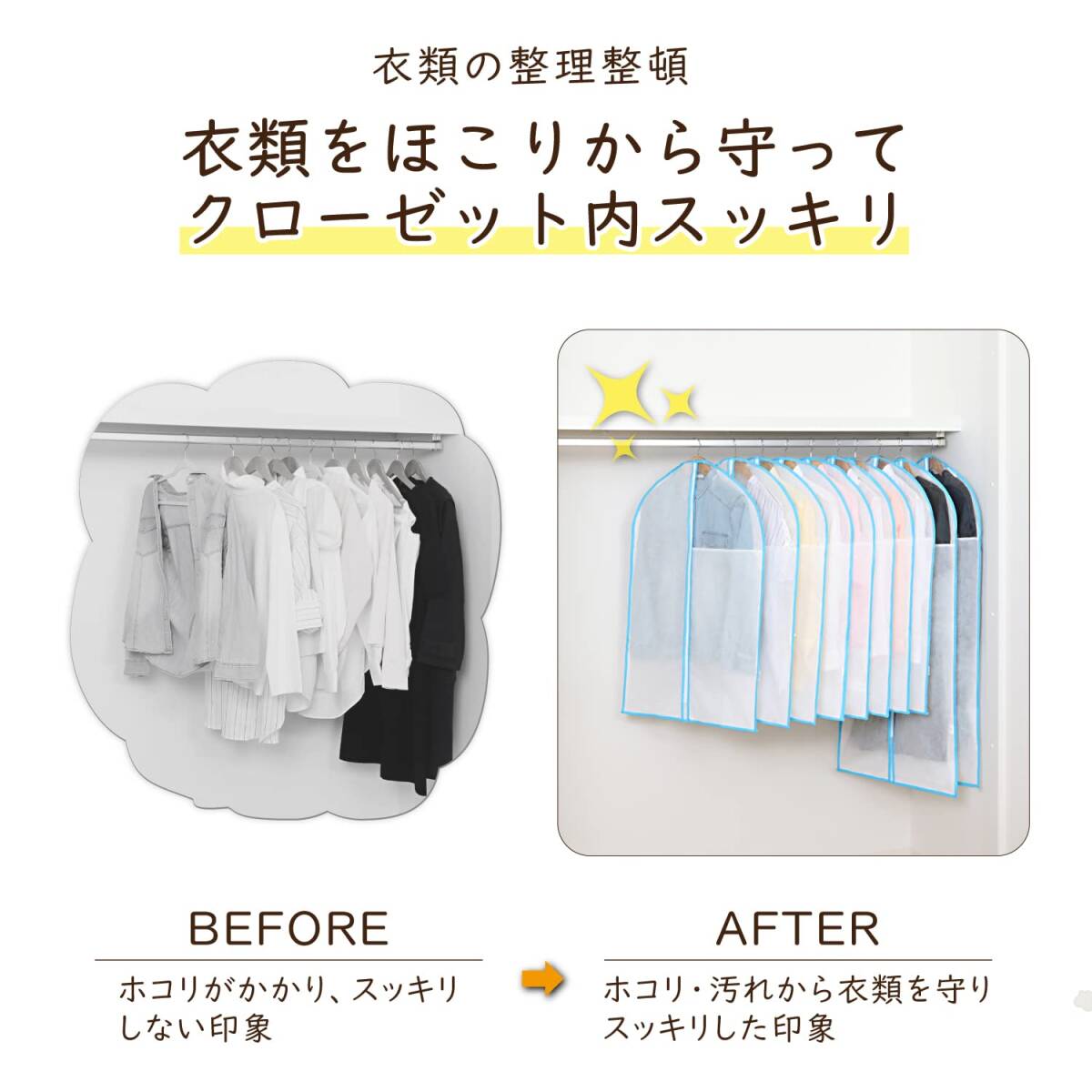 ・【クローゼット内がスッキリ】:カバーをかけて洋服を収納することで、クローゼット内がスッキリ。