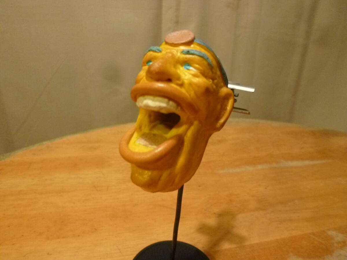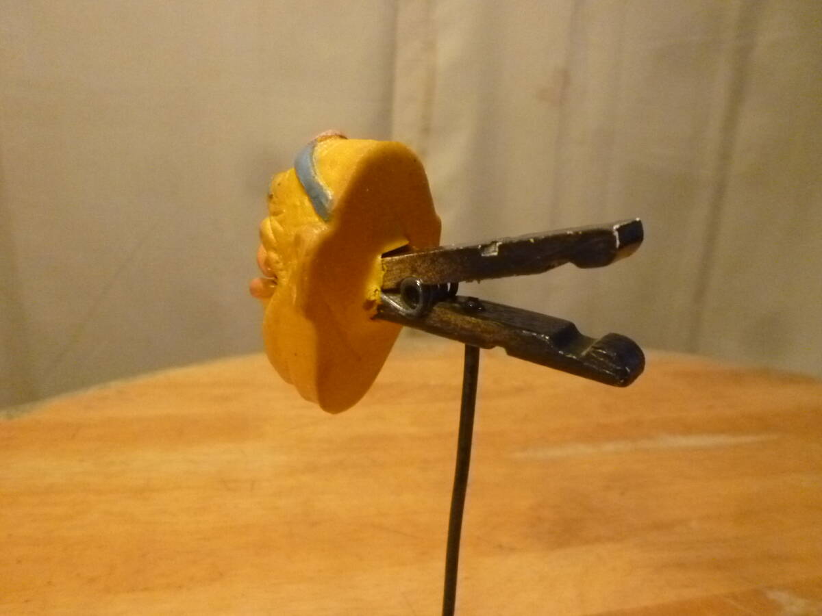 こちらは不気味なおじさんのクリップ?の様で、後部をつまむと大きく口を開き、離すとしっかりと挟みます。口の開け閉めは非常に柔らかくスムーズに動きますが、その為素材はソフトで粘着がかなり強めにあり、底はプラ製で瓶のフタの様で、立ち上がりや木製つまみ等も手造り感があります。