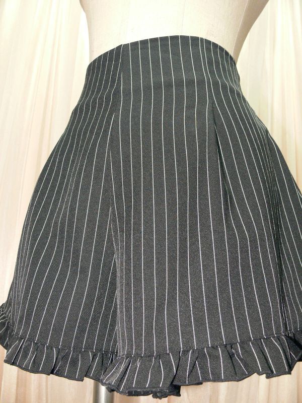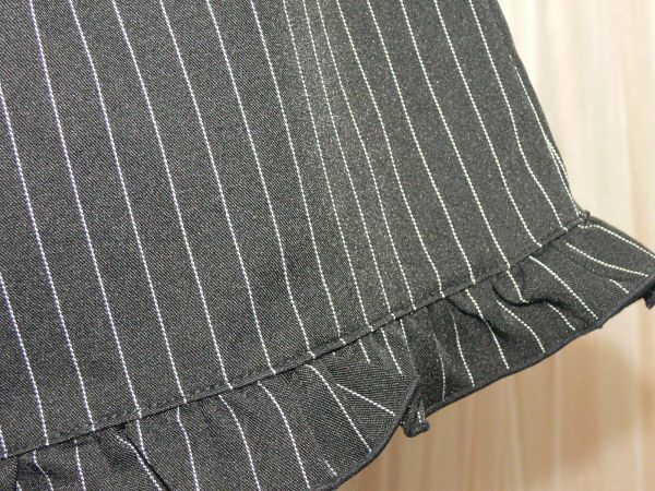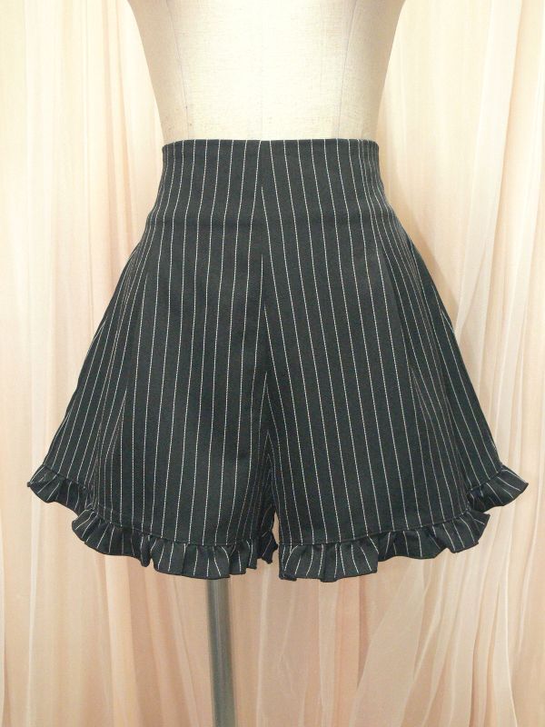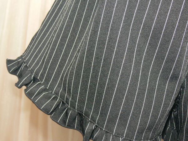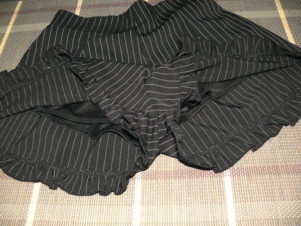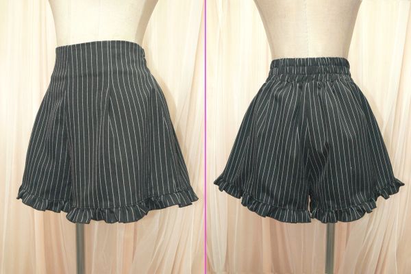 白黒ストライプ生地のフリルスカート風キュロットパンツです。