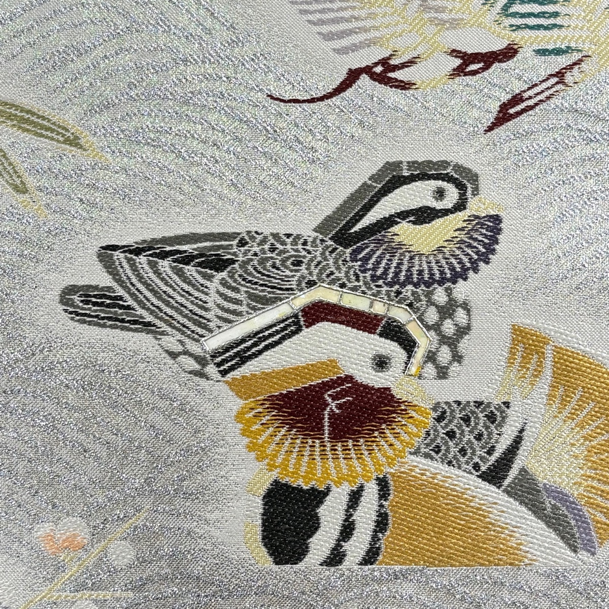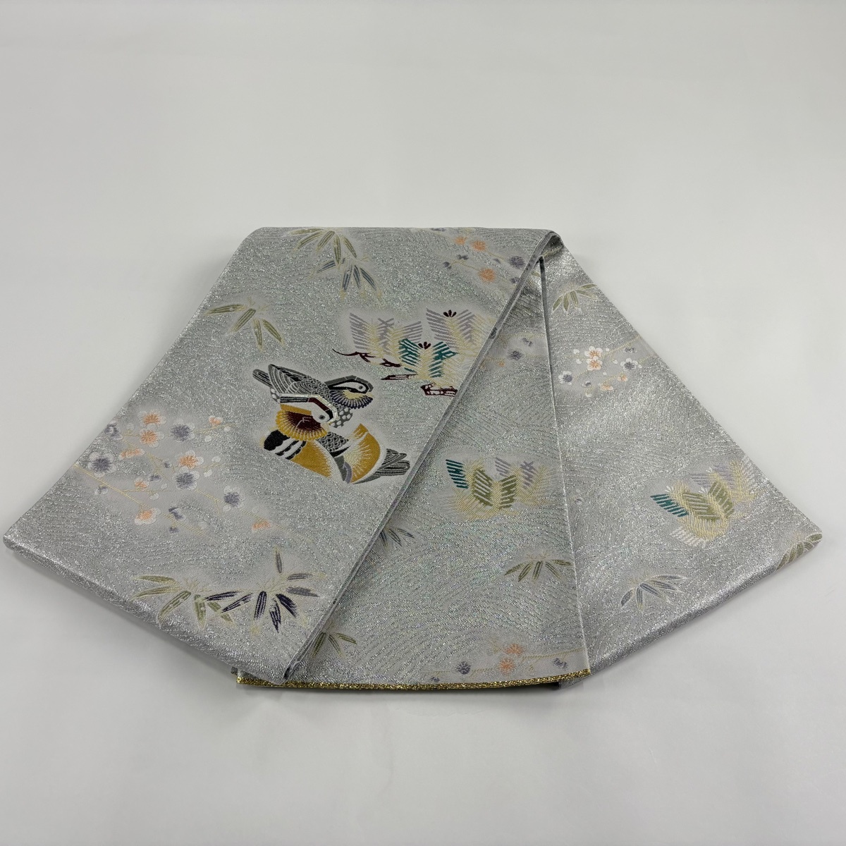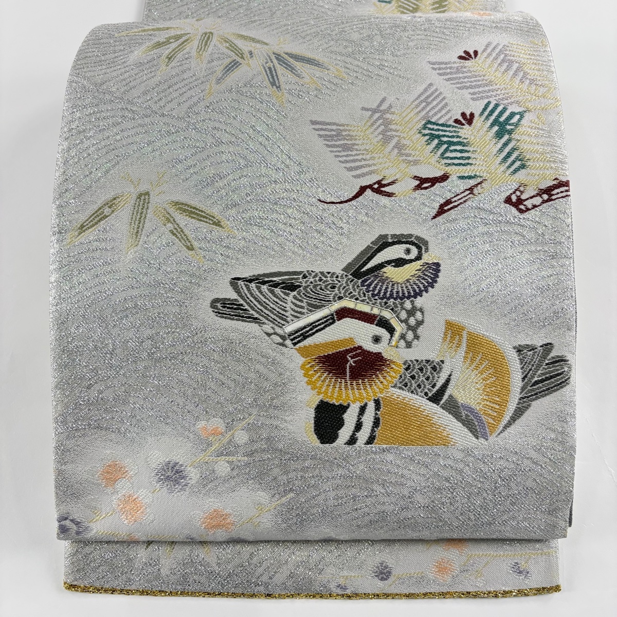 | 袋帯 逸品 羽田登喜男監修 落款 鴛鴦 松竹梅 螺鈿 箔 灰色 お太鼓柄 正絹 【中古】 |