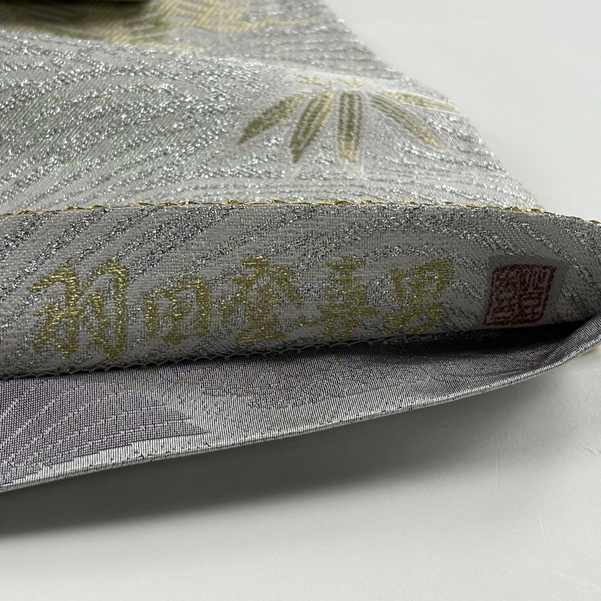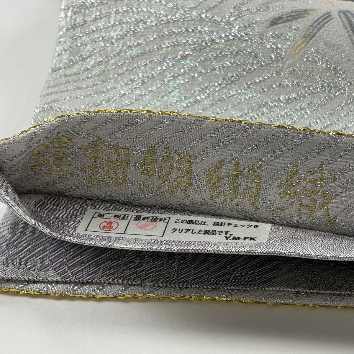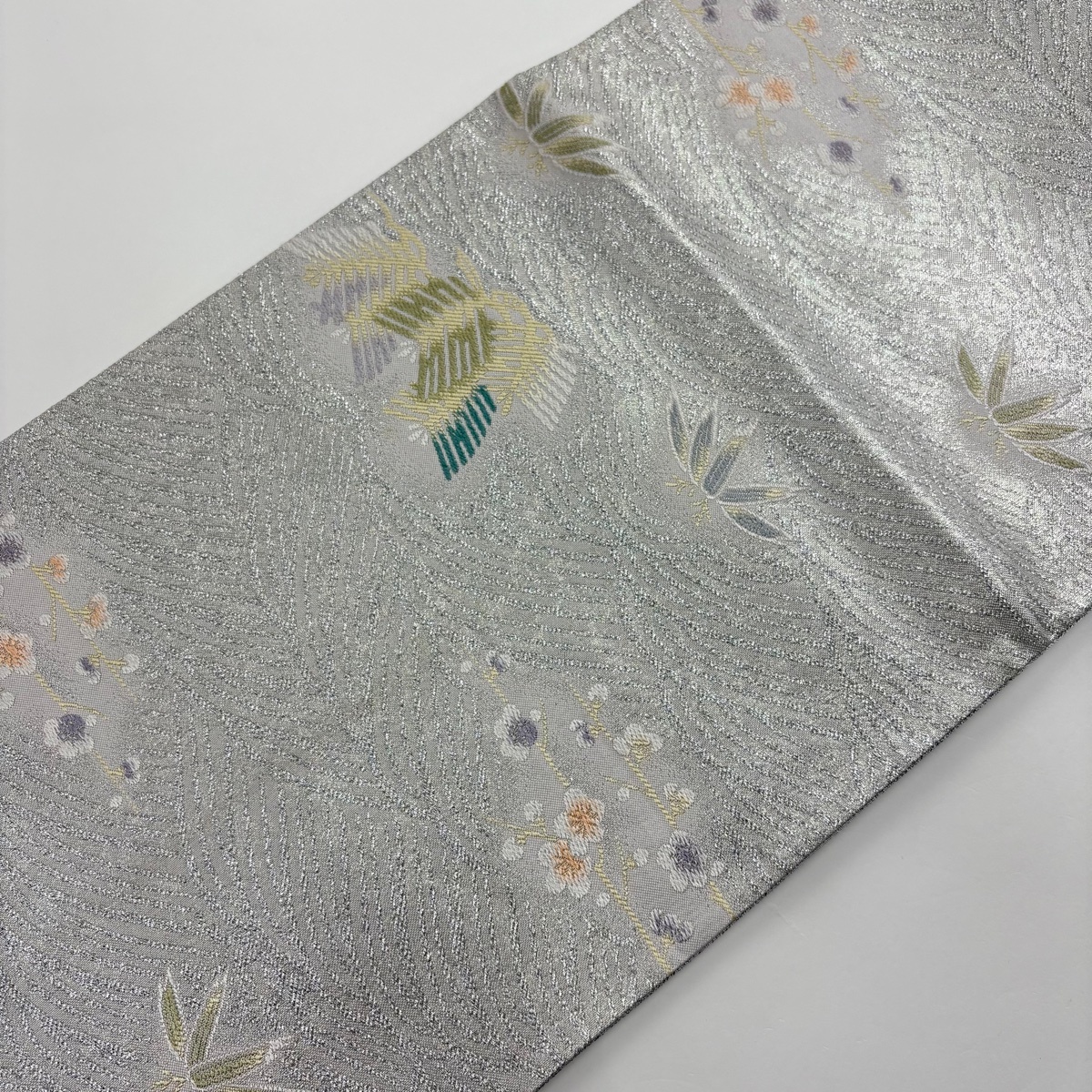 | 袋帯 逸品 羽田登喜男監修 落款 鴛鴦 松竹梅 螺鈿 箔 灰色 お太鼓柄 正絹 【中古】 |