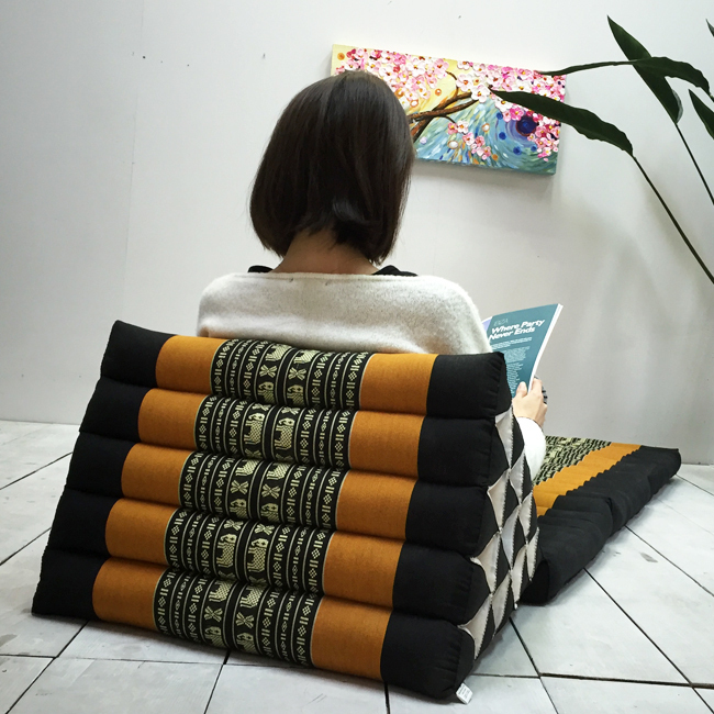 スタンダード 三角枕5段+マット3 (タイの伝統的な刺繍デザイン) インテリア雑誌の「デザイナーのお部屋紹介」などに登場する三角形のまくらのようなクッション。あれは【三角枕】と言う商品なのです。昔、農民が休憩用に寄りかかれる大きなまくらを作った事が三角枕の始まりです。「以前宿泊したホテルで見たことがある!」という方もいらっしゃるのではないでしょうか。三角枕は肘掛クッション・背もたれクッションと大活躍の枕という名の三角形のクッションです。三角枕4段マット付きは、畳・フローリングの上など場所を選ばずお使いいただけます。 | |||||||||||