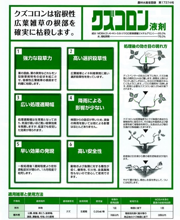 ・一般に、クズコロン処理後2日目頃から奇形捻転症状が現われ、1週間で褐変し10日目頃から枯死します。