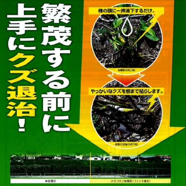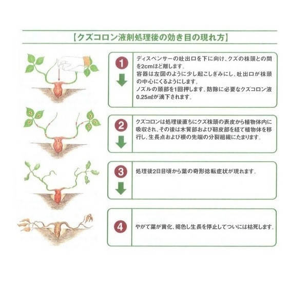 ・液剤を株の頭に一押滴下するだけ、やっかいなクズを根まで枯らします。