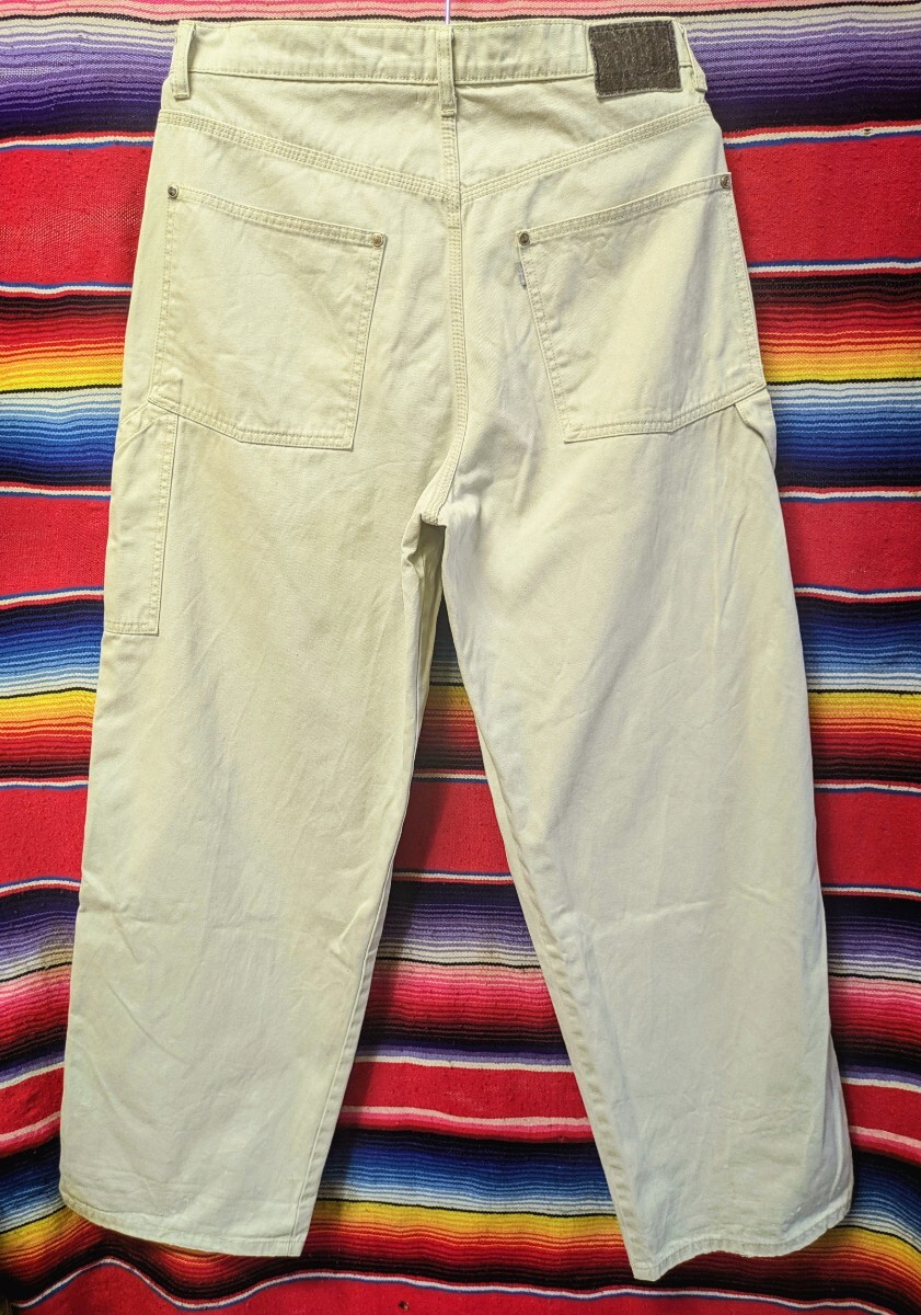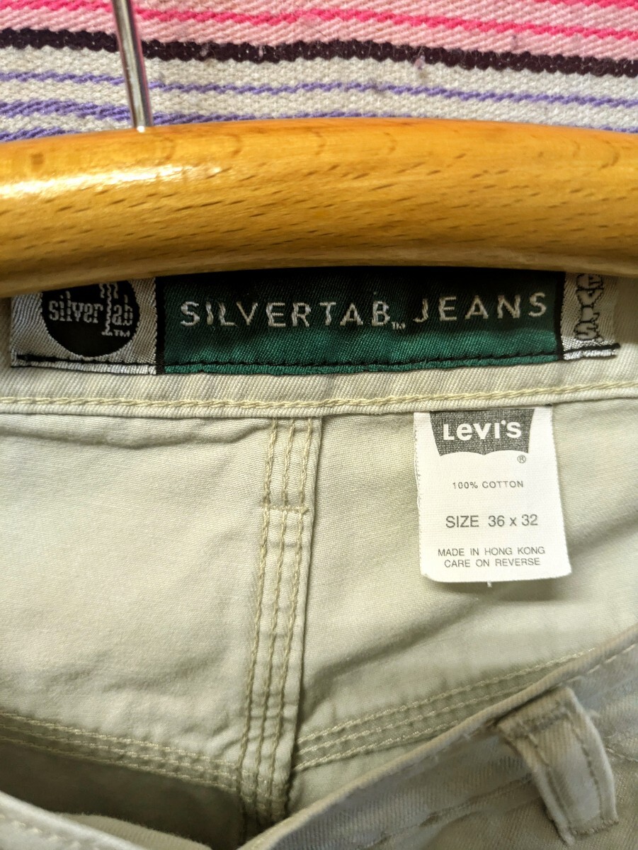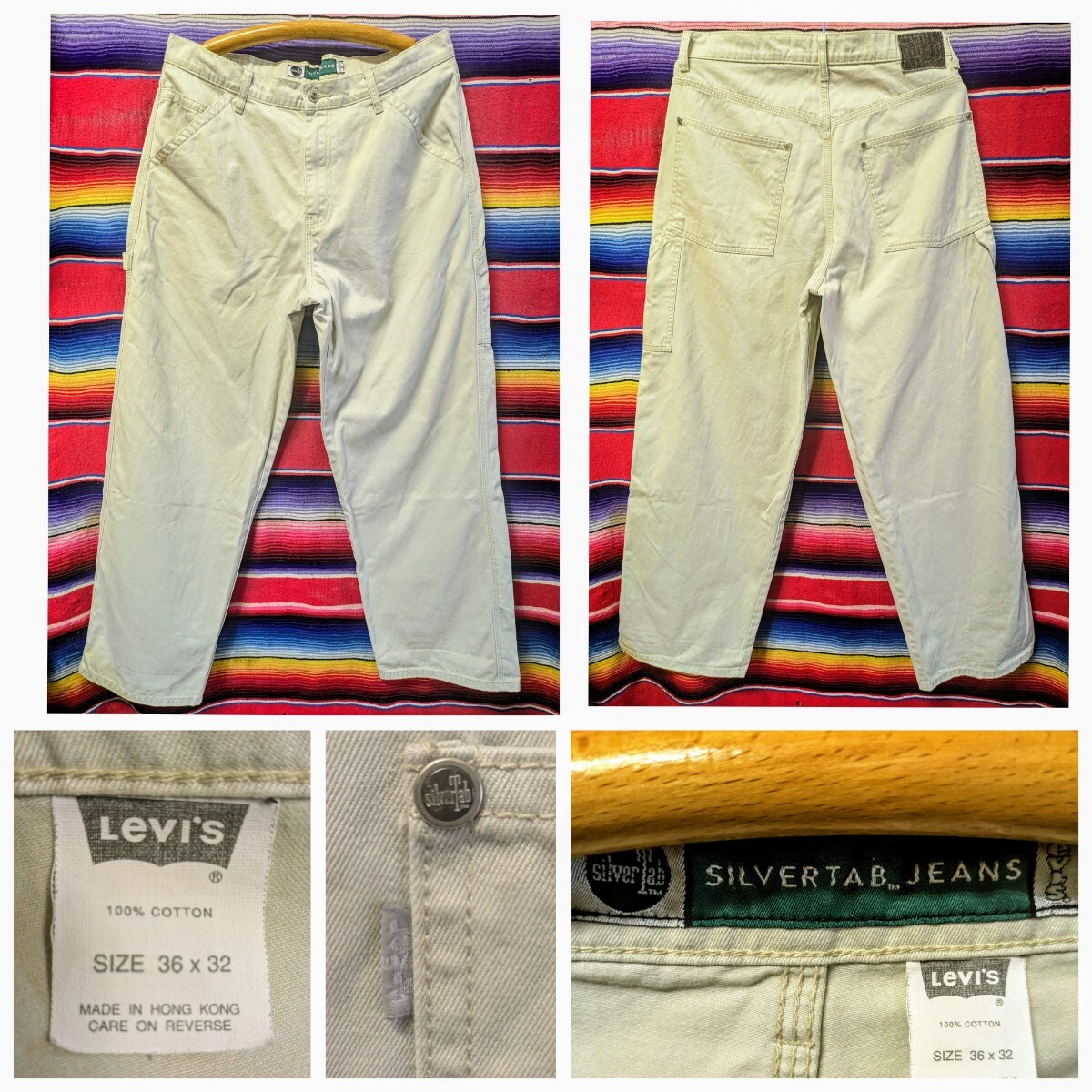 希少な90年代香港製リーバイスSILVER.TABツイルワークパンツの出品。サイズ表記36×32。実寸はウエスト約48センチ、股下約76センチ、総丈約108センチ程度。colorオフホワイト、生成り。カーペンターポケットを含む6ポケット、ジッパーフライ、SILVER.TAB刻印ボタン、刻印入リベットなどのディテール。雰囲気充実の1本。格安での出品ですが古着及びヴィンテージ、オークションでのお買い物にご理解ある方のみ自己紹介欄を一読のうえNCNRにてのご入札でお願いいたします。