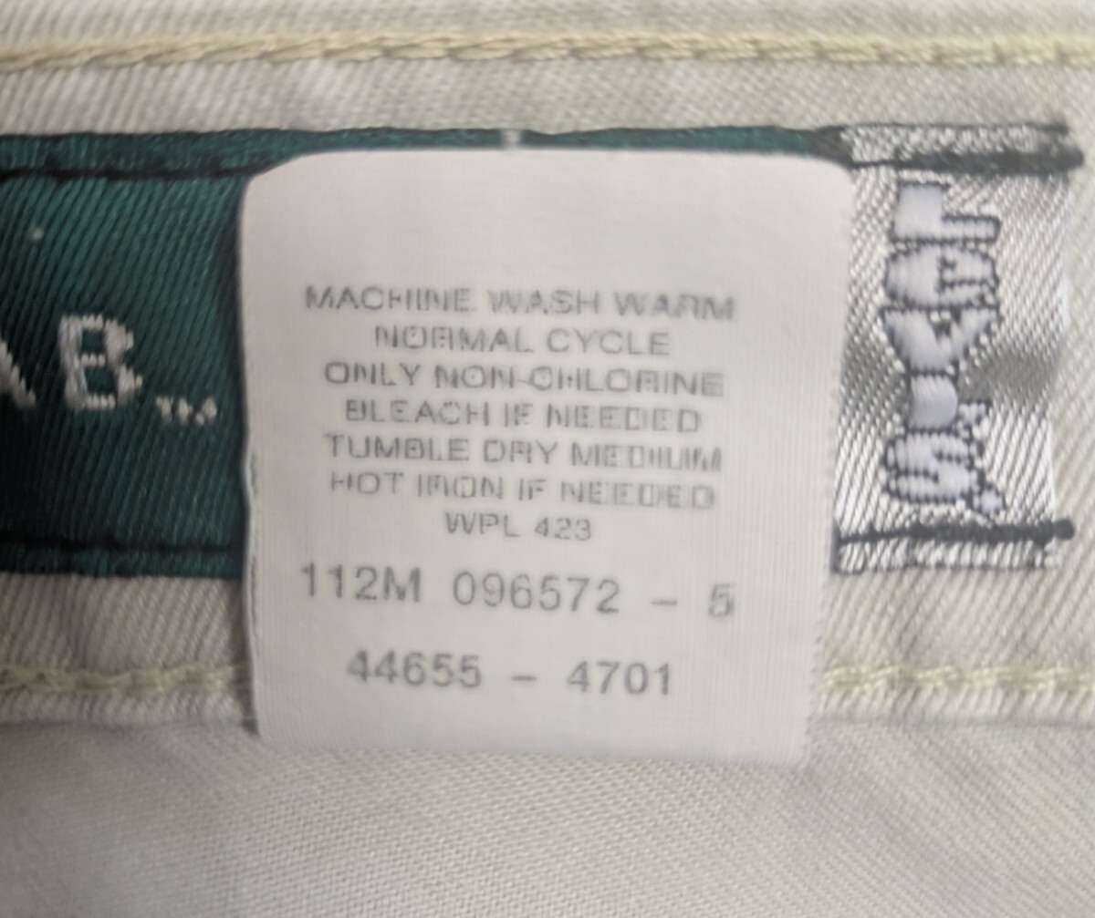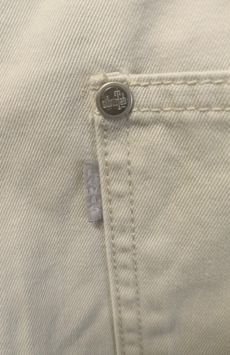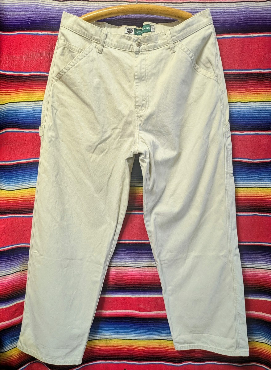希少な90年代香港製リーバイスSILVER.TABツイルワークパンツの出品。サイズ表記36×32。実寸はウエスト約48センチ、股下約76センチ、総丈約108センチ程度。colorオフホワイト、生成り。カーペンターポケットを含む6ポケット、ジッパーフライ、SILVER.TAB刻印ボタン、刻印入リベットなどのディテール。雰囲気充実の1本。格安での出品ですが古着及びヴィンテージ、オークションでのお買い物にご理解ある方のみ自己紹介欄を一読のうえNCNRにてのご入札でお願いいたします。