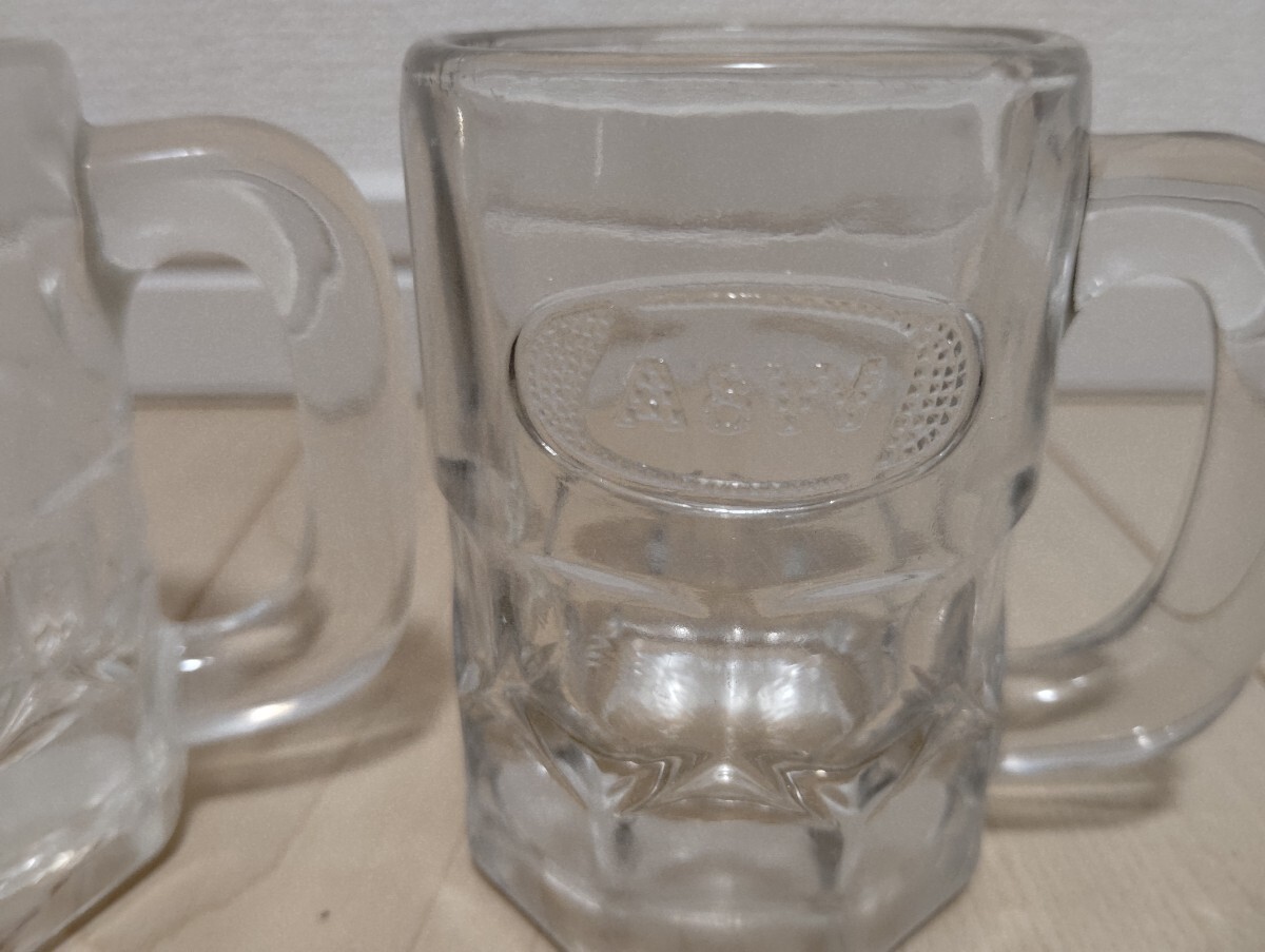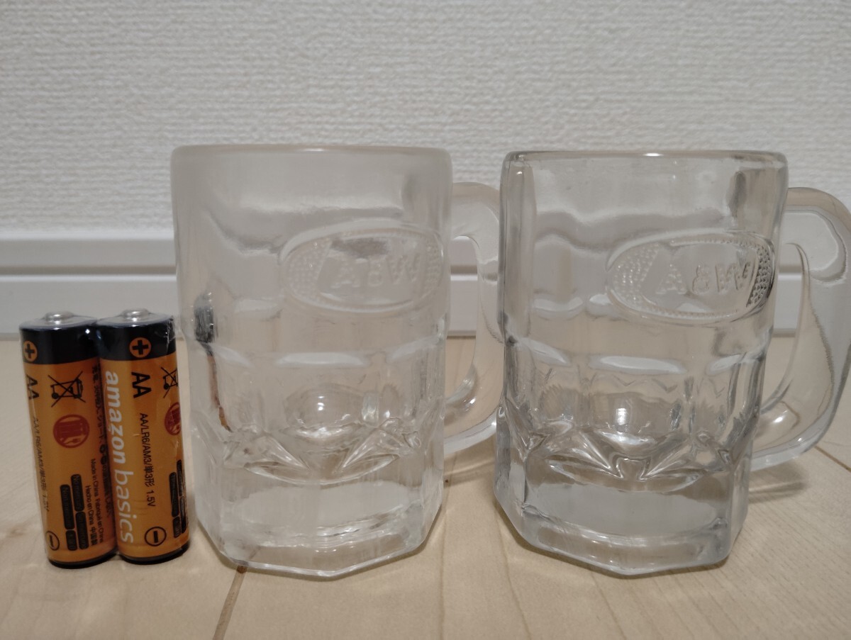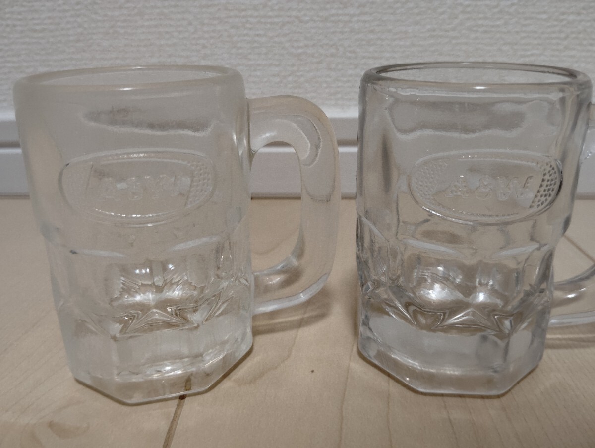 アメリカ発祥のファストフードチェーン「A&W」ロゴ入りのガラス製マグカップです。厚みのあるしっかりした作りで、ビールジョッキやソフトドリンク用としても使用できます。ロゴは立体的に刻印されています。