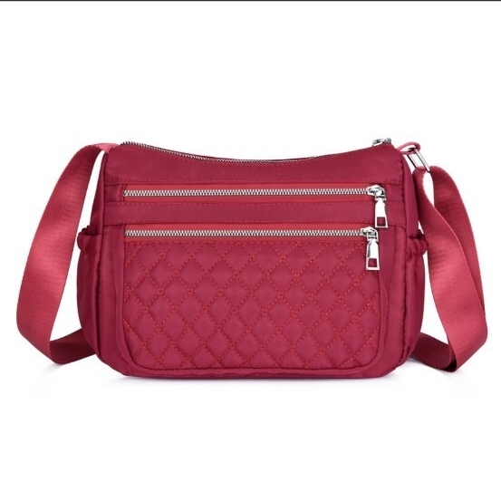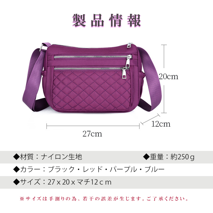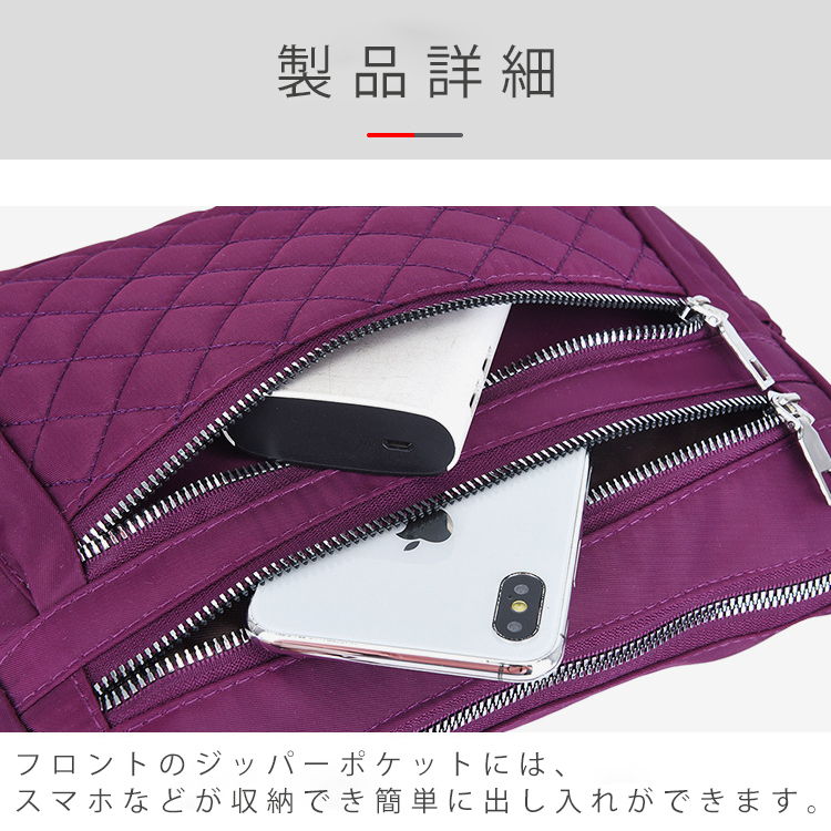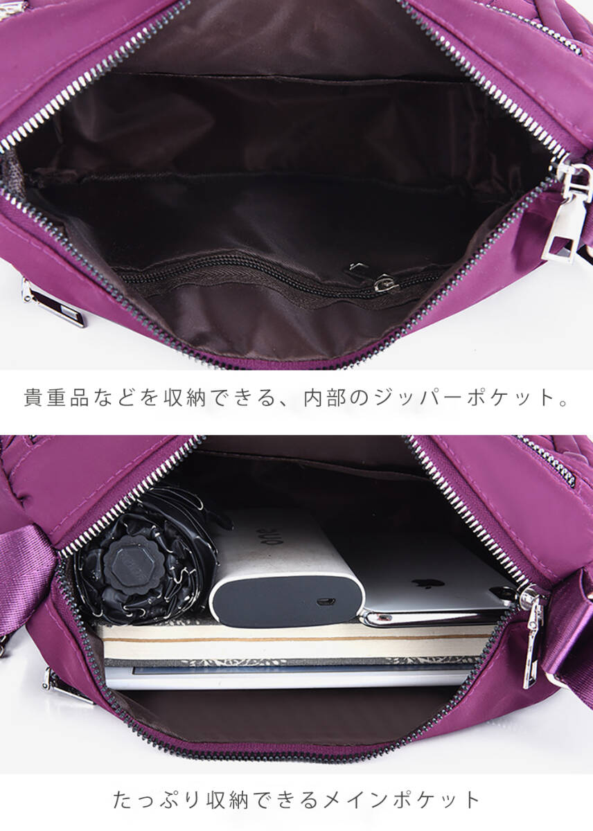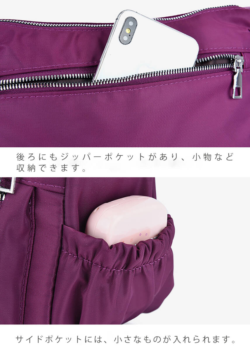 ナイロン素材で軽量なバッグ。荷物の負担になりにくいです。お散歩や、ショッピング、旅行などのお出かけに便利です。沢山ポケットもあるので、整理整頓にも便利。
