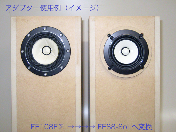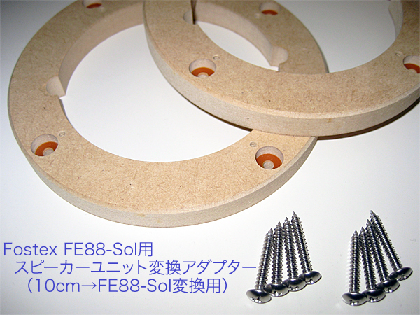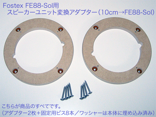 ご覧いただきありがとうございます。 2017年2月にFostex社から限定販売された『FE88-Sol』ですが、入手された方はどのようなエンクロージャーに搭載されていますか。 『FE88-Sol』専用のエンクロージャーがないとか手持ちの他のエンクロージャーでも鳴らしてみたい!!! という方にお薦めのアダプターを製作いたしました。 こちらの商品はお手持ちの口径10cmユニット用エンクロージャーを活用して、上記のFostex FE88-Solを搭載するためのアダプターです。 基本的にFOSTEX社製の10cmユニット(取付穴対角ピッチ115mm)からFE88-Solへの交換用としてご用意させていただきました。 Fostex FE103En、FF105WK、FE108EΣ、P1000Kの他、Mark AudioのAlpair7やPARC Audioの10cm(120番台のシリーズ)ユニット等、スピーカーユニット固定用穴の対角ピッチが115mmのユニットに替えてFE88-Solを搭載することが可能になります。 FE88-Solの他、同形状のフレームを持つMG850やFE88ES-Rにも使用することが可能です。 本アダプターの仕様(製作寸法)は下記のとおりです。 ・材質=MDF(中密度繊維板) ・板厚=12mm ・外径寸法=130mm ・内径寸法=90mm(2ヶ所の端子用の欠き込みもしてあします) ・アダプター固定用穴の対角ピッチ=115mm(φ4mm貫通穴/4穴) →FE88-Solのフレームに干渉するため段落ちとし、内部にベークライト製の ワッシャーを埋め込んであります。 ・ユニット固定用穴の対角ピッチ=100mm(φ2mm下穴/4穴) ・付属品=アダプター固定用のステンレス製トラスビス(φ3.5mm×25mm)8本 (FE88-Solユニットの固定には製品に付属ずるビスもしくは落札者様ご自身で 調達したものをご利用ください) 図面で確認したい方はこちらをご覧ください。 (外部のPDFファイルにリンクしています) 本アダプターの使用方法ですが、 手持ちの口径10cmユニット用エンクロージャーのユニットを取り外し、本アダプターを取り付けます。 その後にFE88-Solを搭載するという順序になります。 出品価格は2枚セットの価格で、アダプター本体の他にアダプター固定用のステンレス製のトラスビス(φ3.5mm×25mm)8本を同梱させていただきます。 また、メール便でよろしければ送料は当方にて負担致しますので、落札者様は送料無料です。 こちらの商品はノークレーム、ノーリターンとさせていただきます。何卒ご了承のうえ、入札をお願いいたします。 | ||