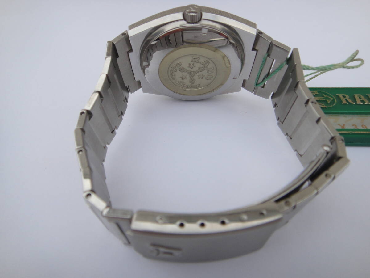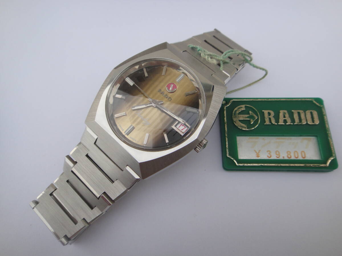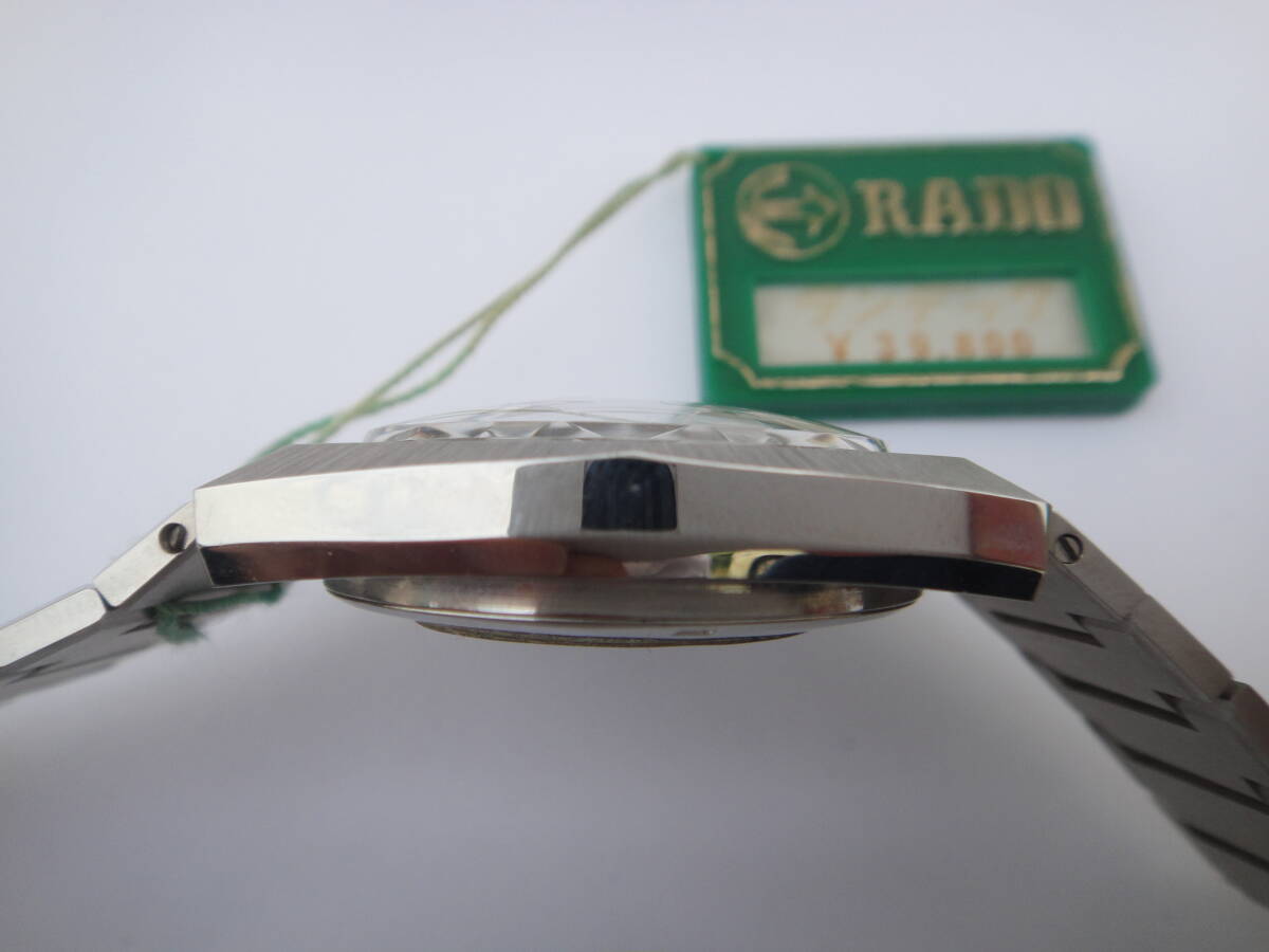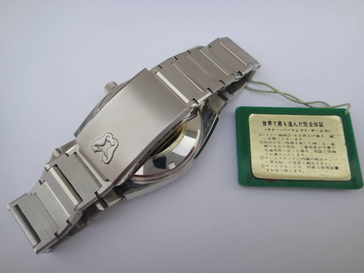 デッドストックで稼働中です。非常に綺麗な状態を保っています。文字板の濃い薄いが綺麗。風防の外側は湾曲してるけど、内側に六角形で何面体かカットされてる。カットガラスのカットエッジ部分が欠けたとかは起こらない。ベルトも時計本体もやや薄目で気に入ってる。ベルト内径17cmでバックルに一コマ残ってる。横幅34ミリの時計です。大切にしてくださる方に。よろしくお願いいたします。