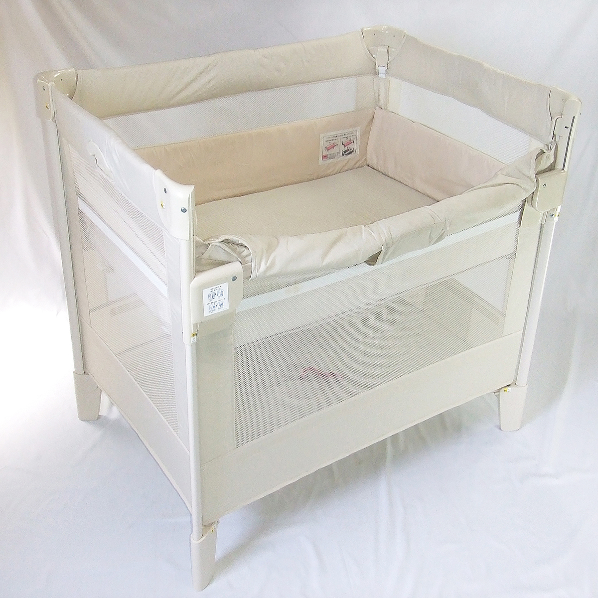 ねむれる・たためる・運べるベッド。 ムレから守る『エアー』のココネルです。 コンパクトに折りたたんで自在に持ち運びできるから、家族旅行や帰省の時など、どこへ行っても安心・快適な環境で眠らせてあげられる新発想のベビーベッドです。 床板の高さを変え、プレイヤードとしても使えます。 【製品仕様】現状優先 ・対象年齢:新生児~24ヶ月頃(適応体重2.5kg~13kg以下) ・本体重量:14.9kg約 ・サイズ:約開:W1041×D737×H950(mm)、閉:W290×D270×H950(mm) ・PSCマーク取得品 ・製品安全協会乳幼児用ベッドSG合格品 |