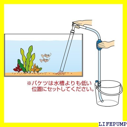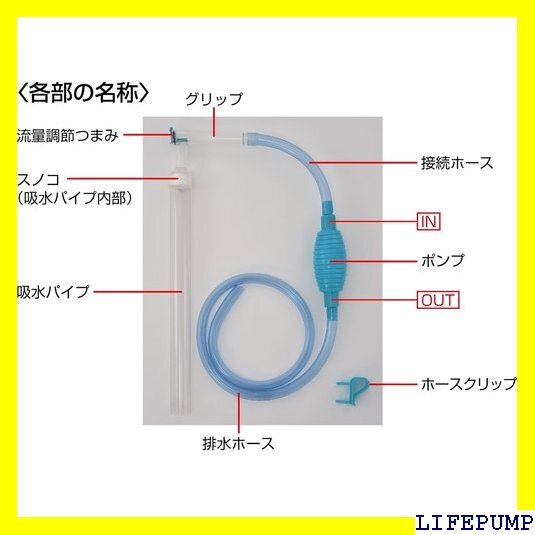 誰でも簡単に使える「シュポシュポ」を砂利クリーナーに採用。無理のない姿勢での水換え、指で流量調節も出来るので女性でも簡単に水換えが出来ます。付属パーツのホースクリップはホースが暴れて水が床にこぼれるのを防げるので大変便利です。 キレイに見える水槽も、砂利の中はフンや残餌等の汚れでいっぱいです。面倒な砂利洗いが水換えと一緒に簡単にできるクリーナーです。手間なく砂利の中のお掃除をして、スッキリキレイな水槽にしましょう! ・片手で簡単に操作できる新設計の流量調節構造。水換えと一緒に砂利の中の汚れだけを掃除できるので水換え・掃除の手間を減らします。 ・排水はポンプを数回押すだけで簡単。また、ポンプが手元にあるので、無理のない姿勢で排水をスタートできます。 ・長めのパイプなので、底砂がたっぷり入った水槽でも奥までしっかり差し込んで、砂利の中まで掃除できます。 ・排水ホースをバケツに固定するホースクリップ付き。排水中にホースがうっかりバケツから出るのを防ぎます。 ・砂利掃除だけでなく、水替えにも使用できます。 1.吸水パイプを水中に、排水ホースをホースクリップでバケツに固定します。 2.グリップを握り、流量調節ツマミを最大にしてポンプを数回押し、排水をスタートしてください。 3.吸水パイプを砂利の中に差し込むと砂利が水と一緒に吸い上げられるので、パイプの中で砂利が撹拌されてゴミだけが排出されるように、流量調節ツマミで水量を調節してください。※目の細かい砂を使用している場合は、砂が吸い込まれる場合があります。※水を残してゴミだけを排出したい場合は、砂が吸い込まれる場合があります。 4.吸水パイプを差し込んだ箇所からゴミが上がらなくなれば、流量を最小にしてから吸水パイプを砂利から抜き、パイプに入った砂利を落としてください。 5.再び流量を大きくして、場所を変えて吸水パイプを砂利に差し込んでください。 6.3・4・5を繰り返して、底砂全体を掃除してください。 ※排水ホースが水槽水位より下の位置にないと、排水を開始することができません。※スノコのメッシュ穴より大きいゴミは吸い出すことができません。 適合水槽:高さ36cmまでの水槽 小型水槽~標準的な幅60cm水槽に 排水ホース長さ:約1m ホース径:外径 約13mm、内径 約9mm