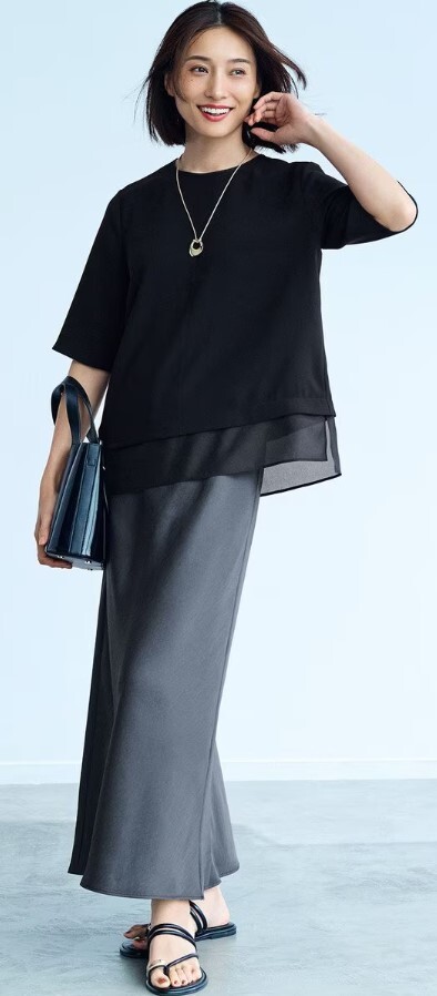 シアー素材で奥行きを出した裾デザインは腰位置を高く見せるスタイルアップ効果と