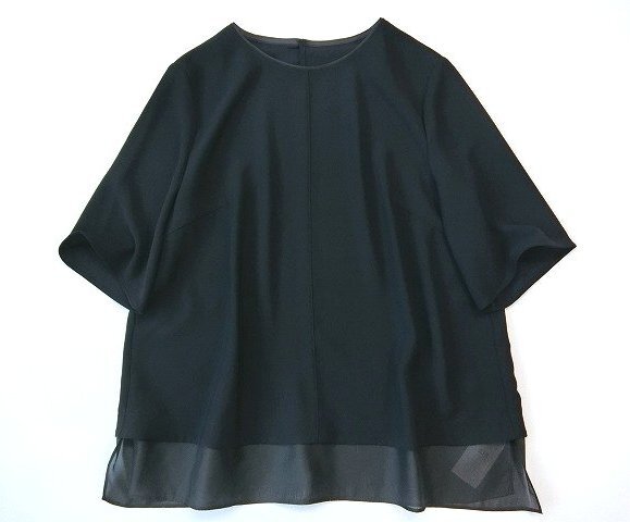 シンプルなTデザインながら、センターに入れたステッチやシアー素材の裾切り替えなど、