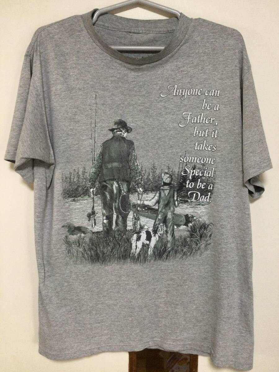 *微笑ましい父子の釣り風景イラストがgood。襟ヨレ〜裏にヨゴレ(洗い済み)、肩幅50、身丈67㌢位(L〜XL)位。以上私感です画像での判断に成ります宜しく。レターパックライト発送。