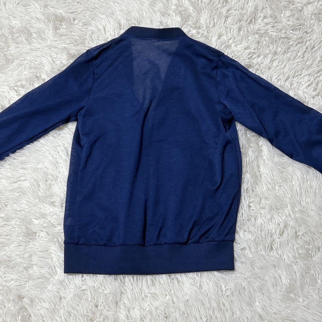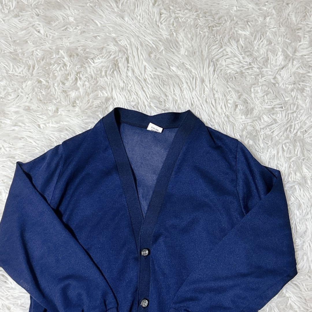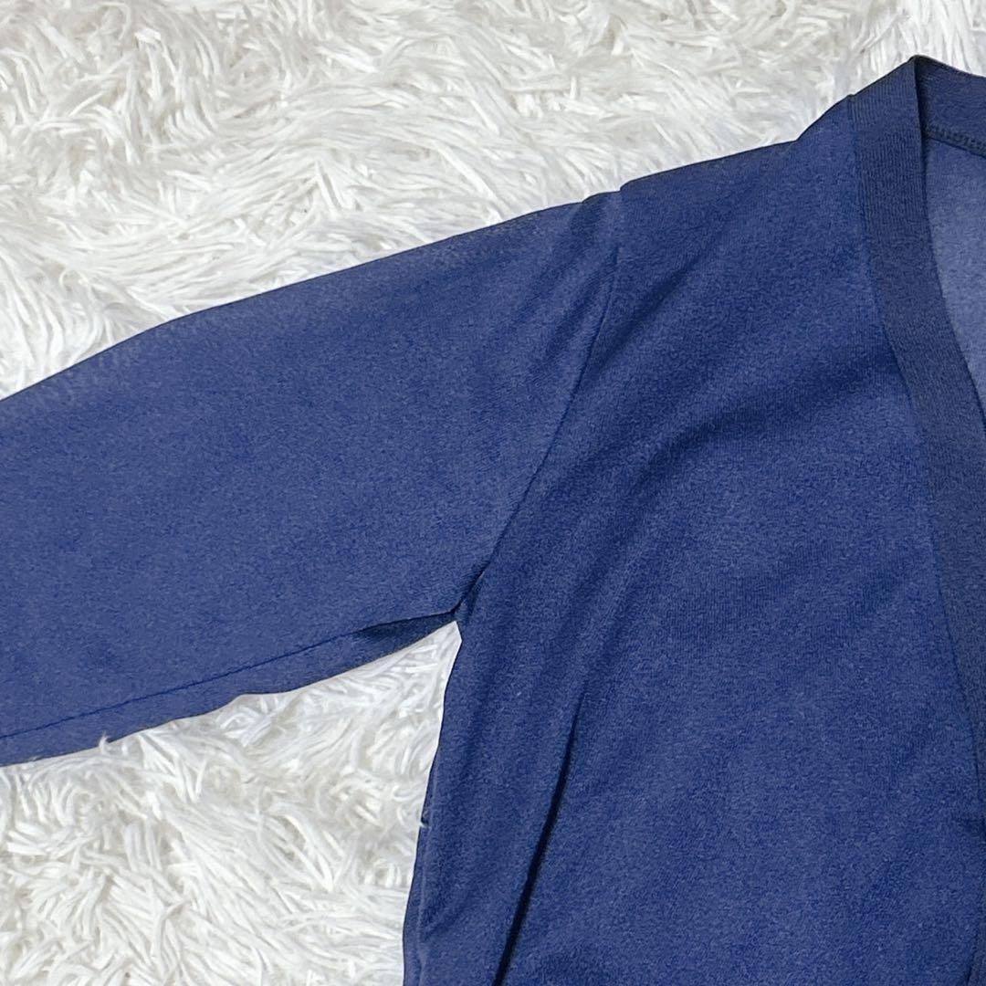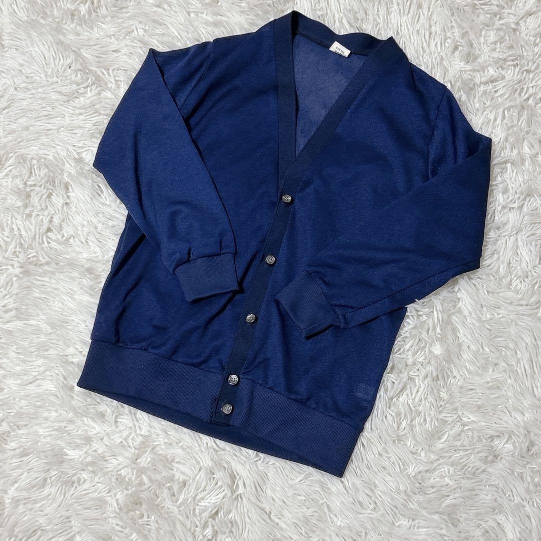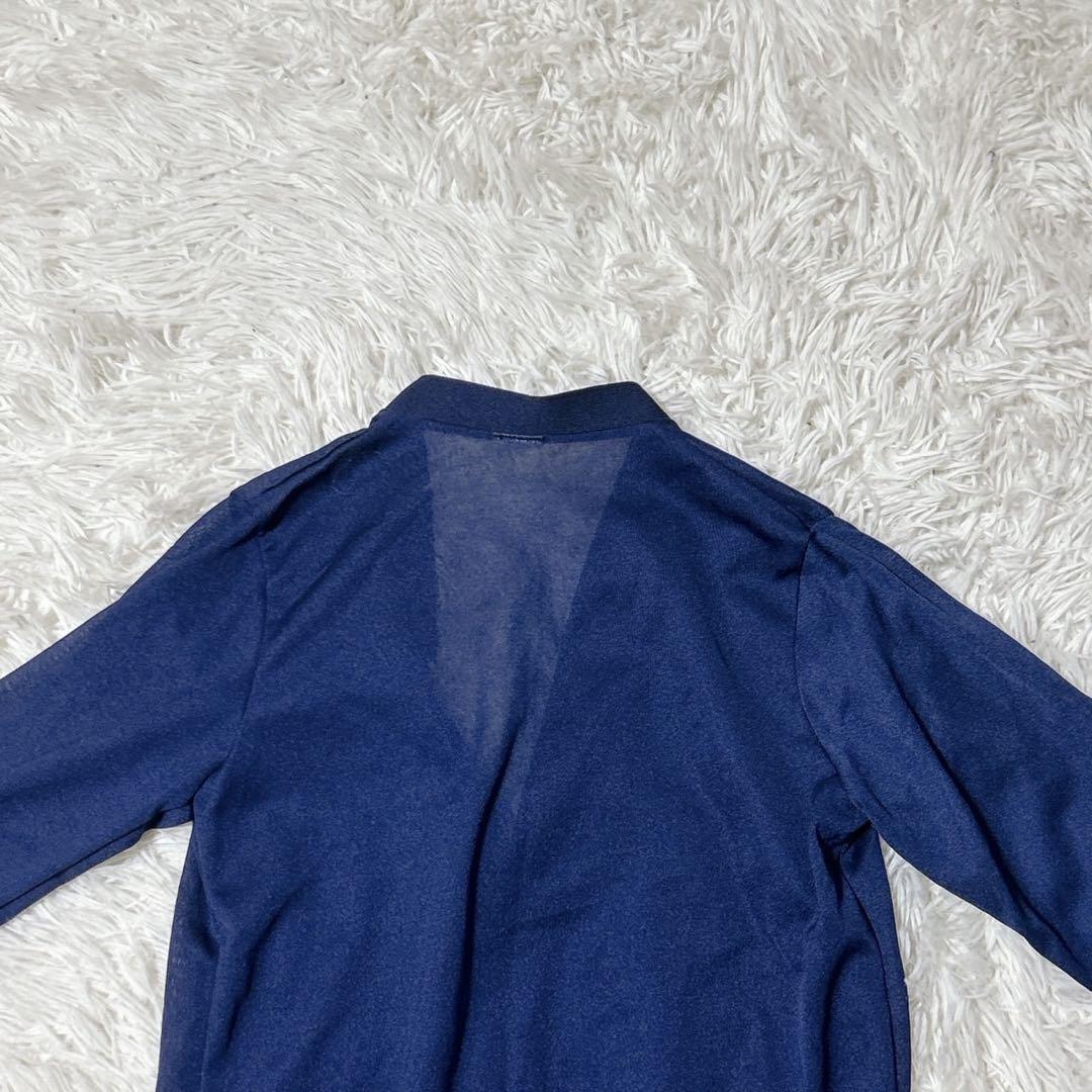 軽量なネイビーのVネックカーディガン、前面ボタン留めでスタイリッシュ。