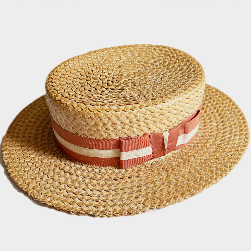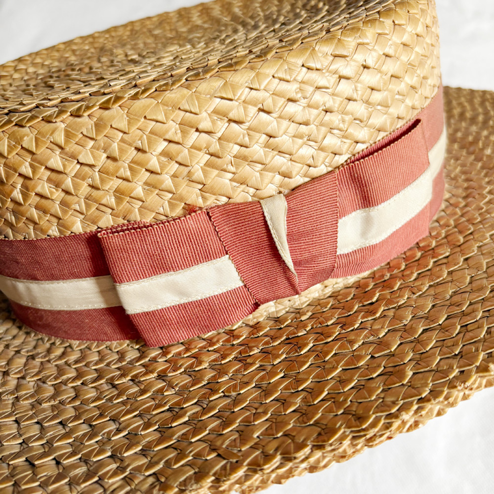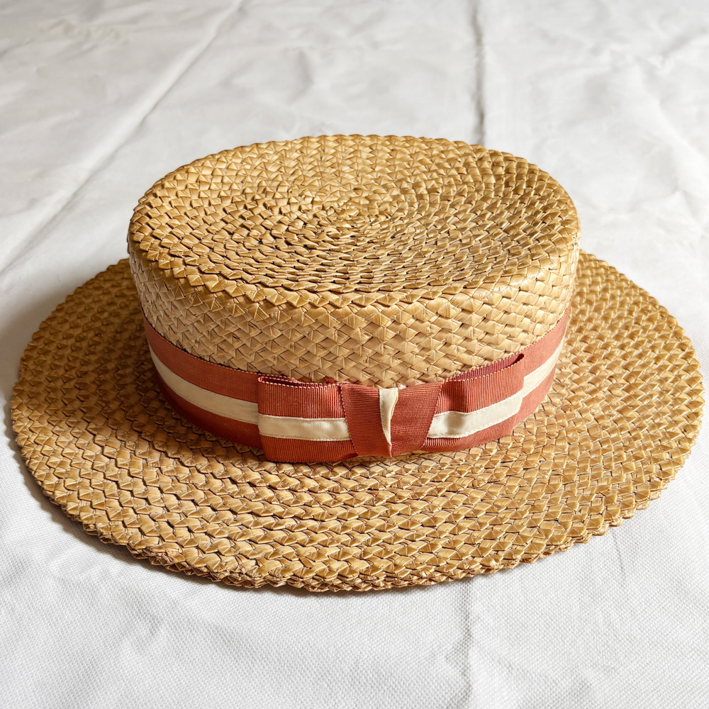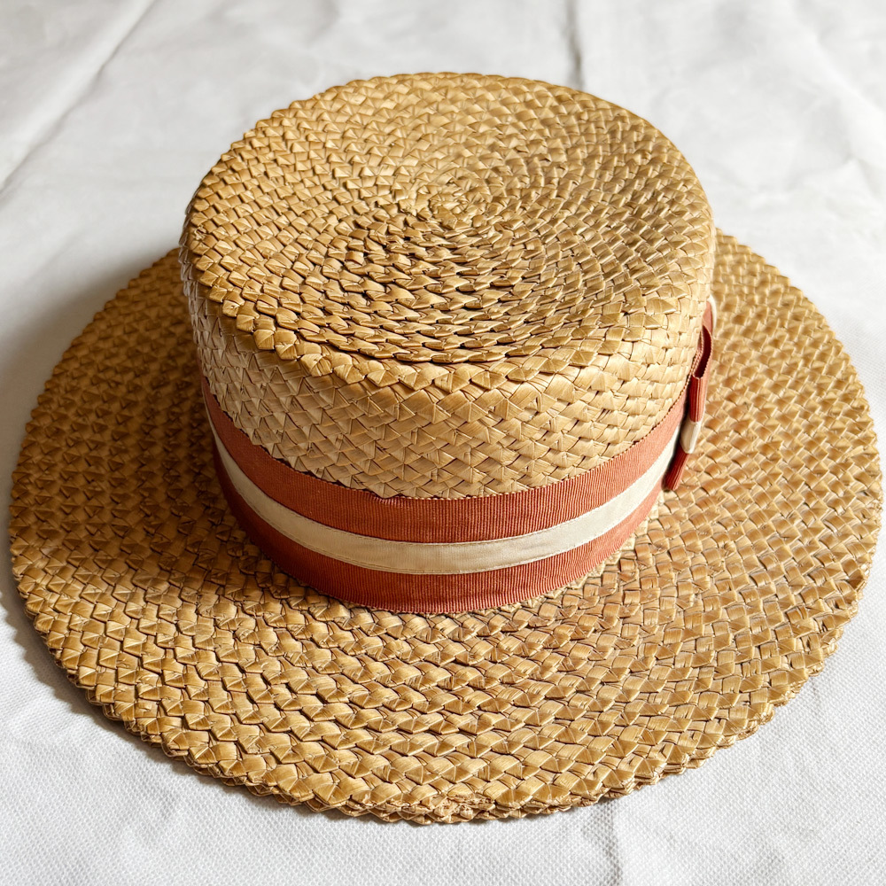 更に、過去に一度しか見た事がない、リボン部分が2色の別々のリボンをわざわざカットし、縫い合わせる事でストライプを表現。オレンジとオフホワイトのコンビネーションストライプリボンを大胆に採用。大変珍しい手の込んだ逸品です!