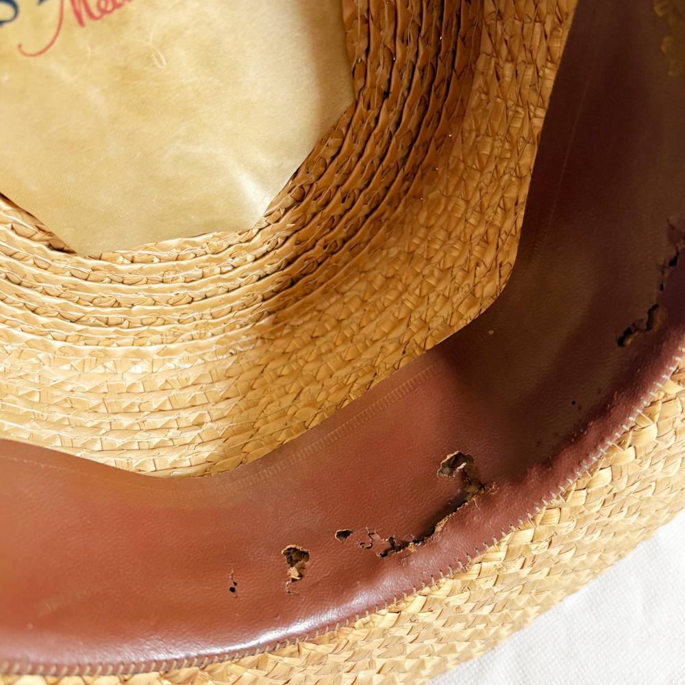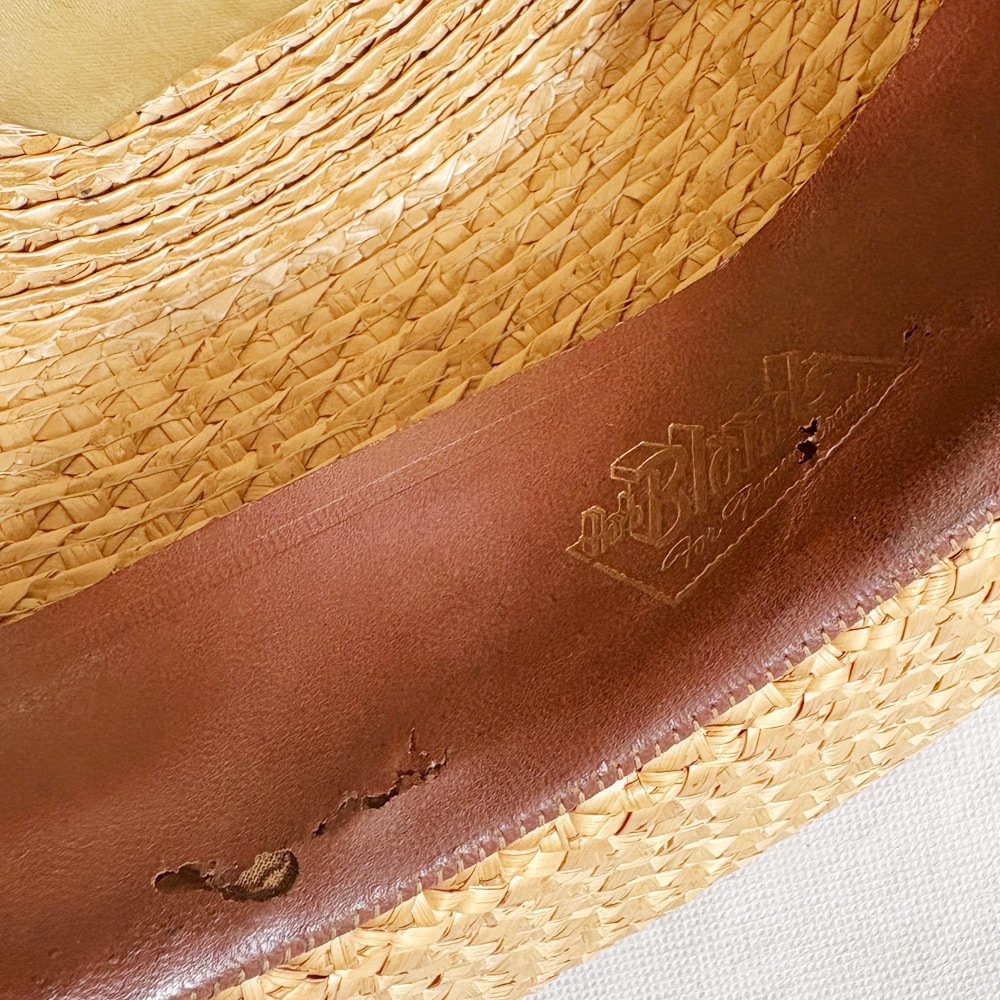 状態はリボンや天裏の装飾に若干の薄汚れあり、ブリムエッジに若干スレあり、クラウン後方部にダメージがあり&補修済み。レザースベリにいくつか穴の空いたダメージはありますが、硬化しているわけではなく、まだまだ使用可能な状態です。その他目立つ様なダメージのないグッドコンディションかと思います。