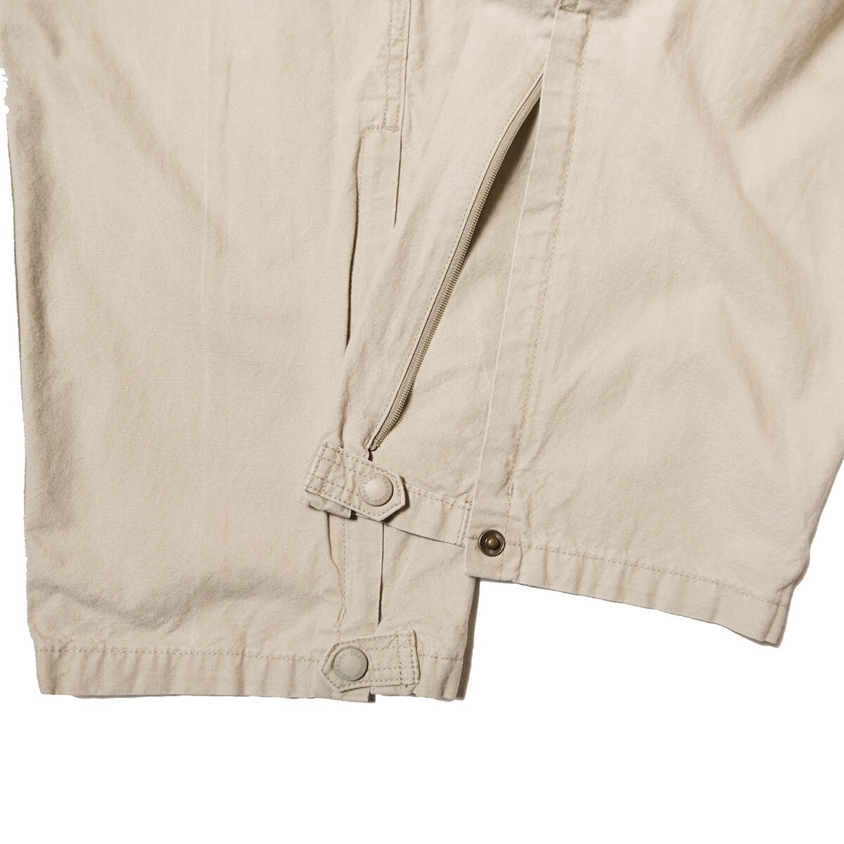 両サイドと右バックにジップ式ポケット、裾内側にジップ付