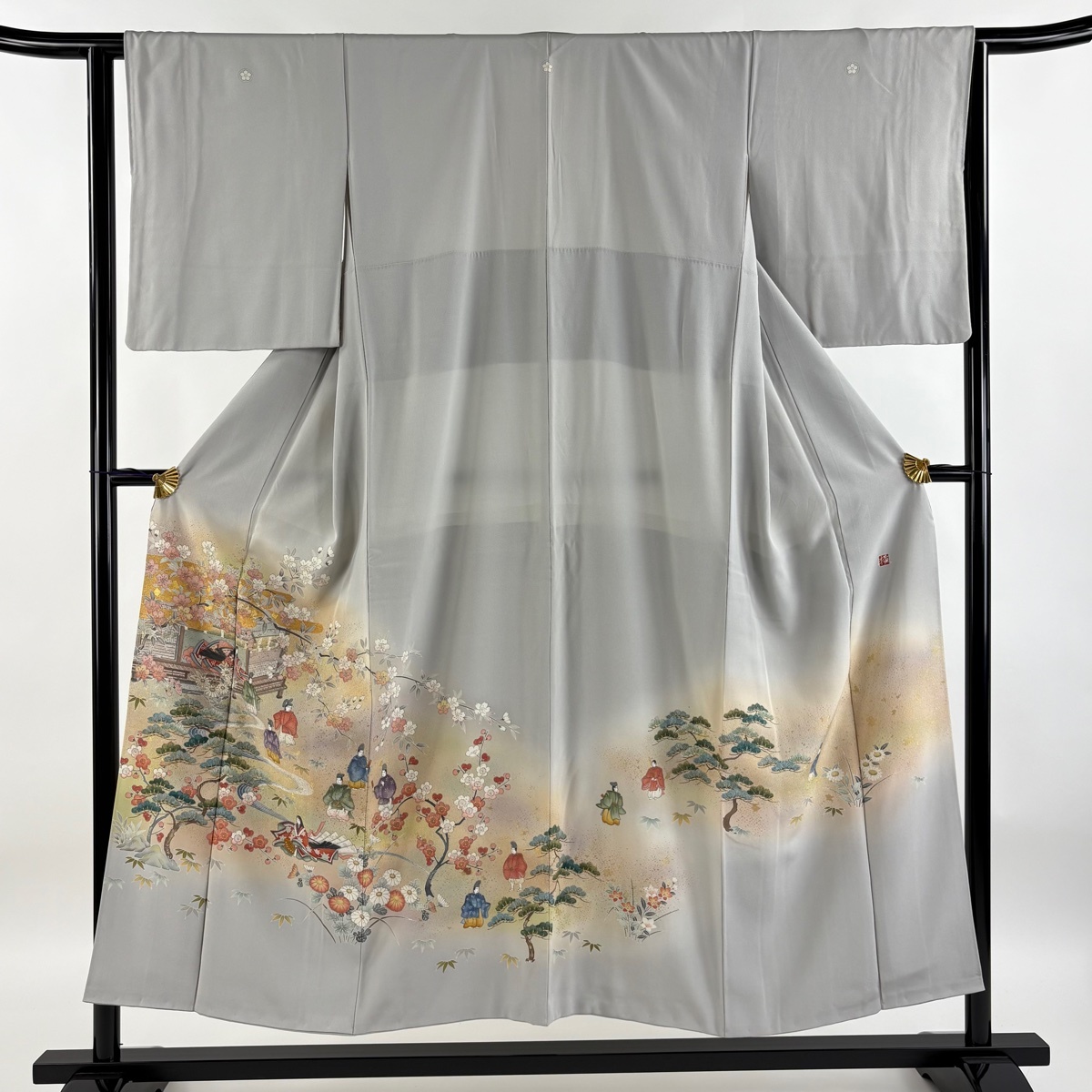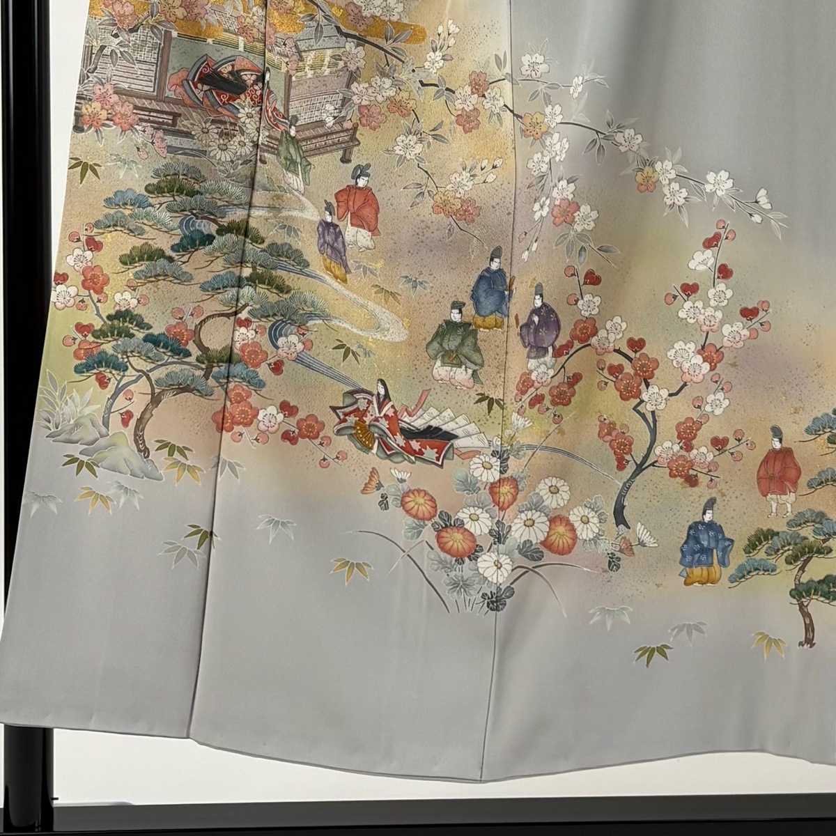 | 色留袖 秀品 落款 御所風景 松竹梅 金通し 灰色 袷 身丈151 裄丈63 S 正絹 【中古】 |